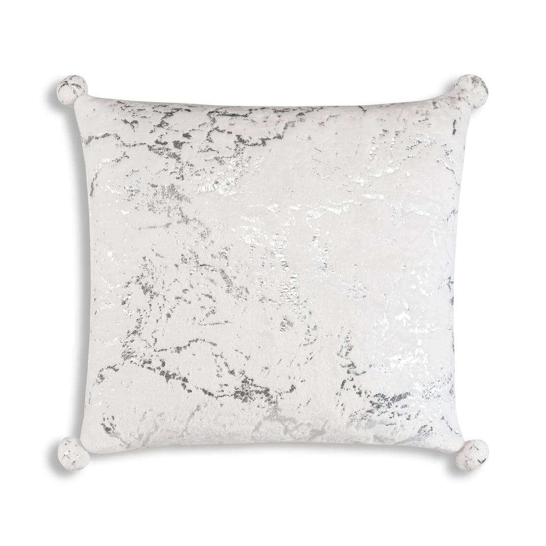 Faux fur pillow with silver printing and pom pom trim on the edges
