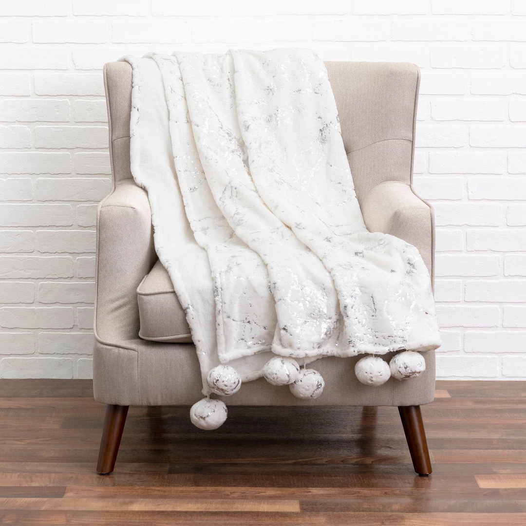 Faux fur throw with silver metallic printing and pom pom trim
