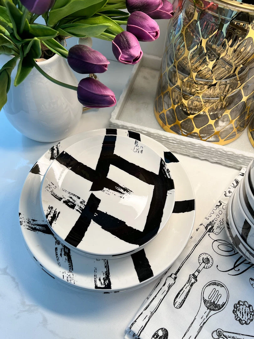 Description: This set of 12 dinnerware set has such a cool black brushstroak pattern! It is a great option to bring some texture to your tablesetting!