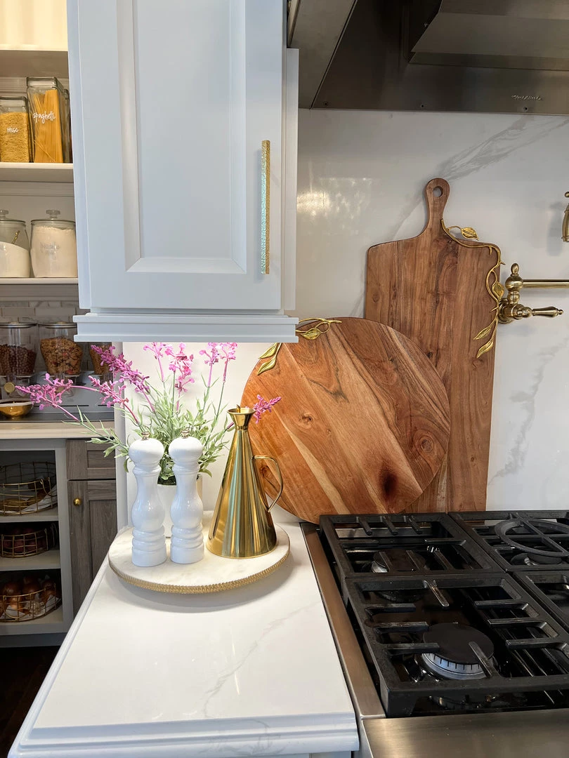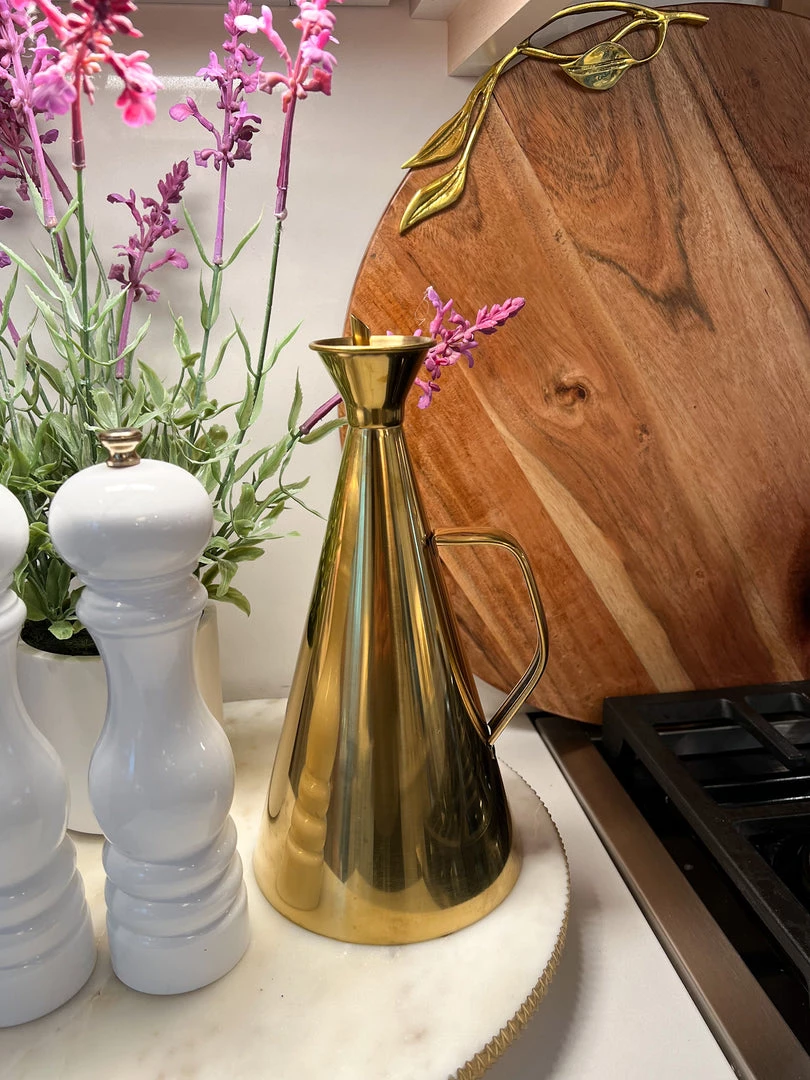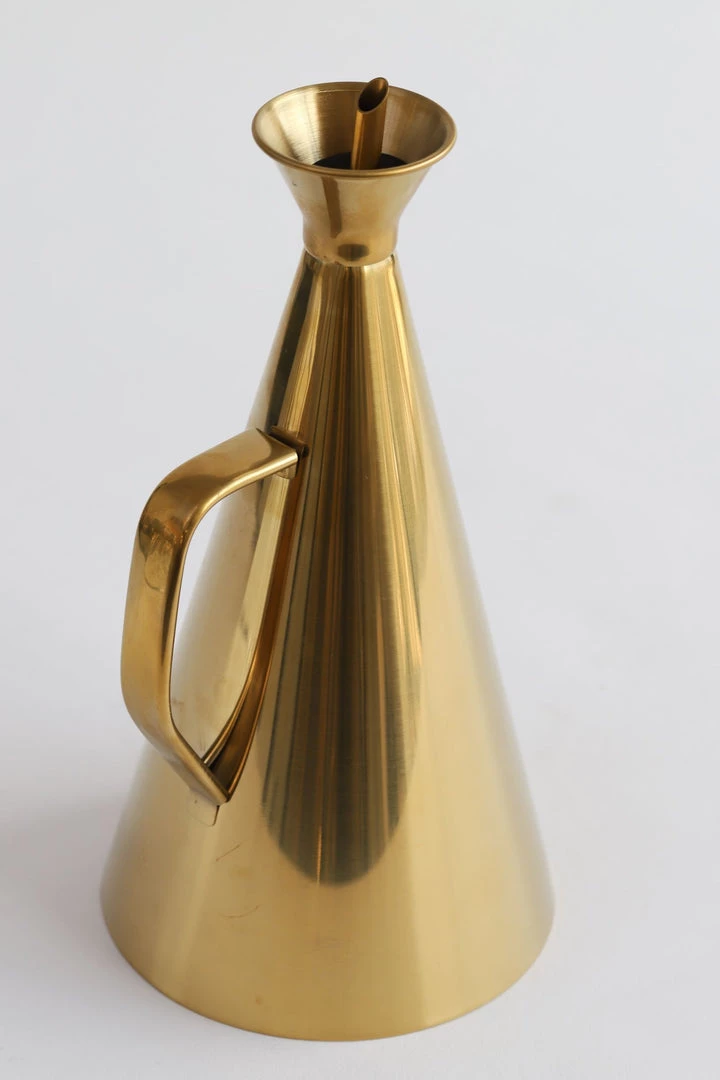 Description: This stunning gold metal oil dispenser has a removable pour spout so you can fill it with oil and store it in style!