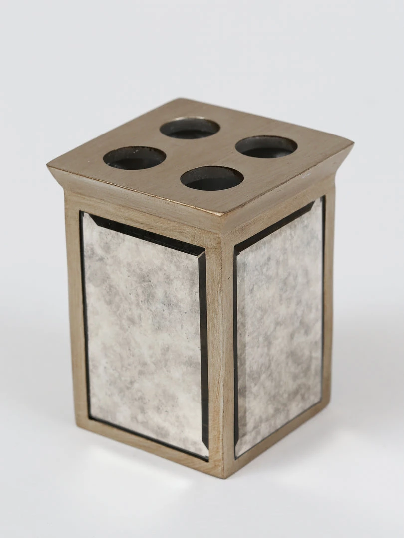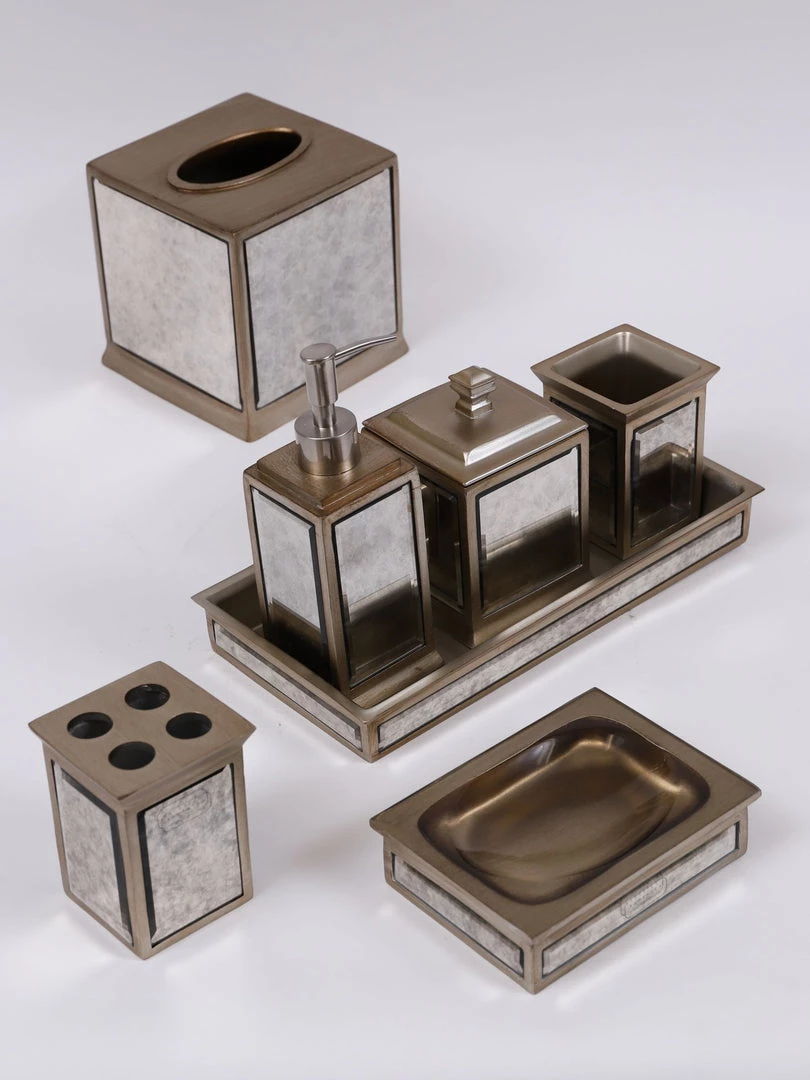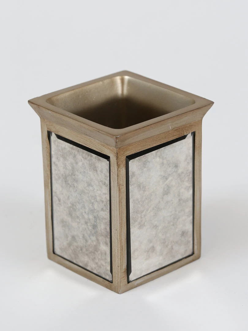 Description: This beautiful bath collection will bring vintage glamour into your home! The beautiful marble printed panels are accented with a beautiful metallic finish to create a unique and elegant look! This collection includes a toothbrush holder, soap dispenser, tumbler, soap dish, cotton ball jar, tissue box cover, and a tray. Each piece is sold separately.