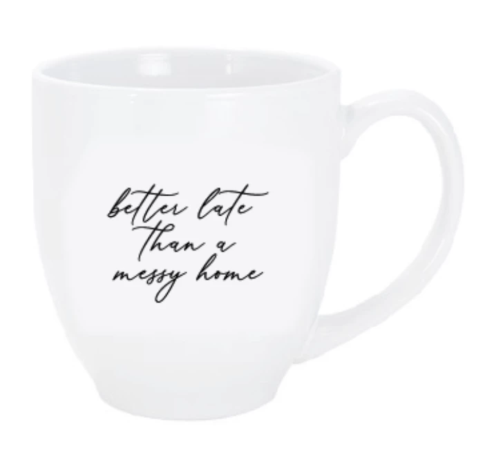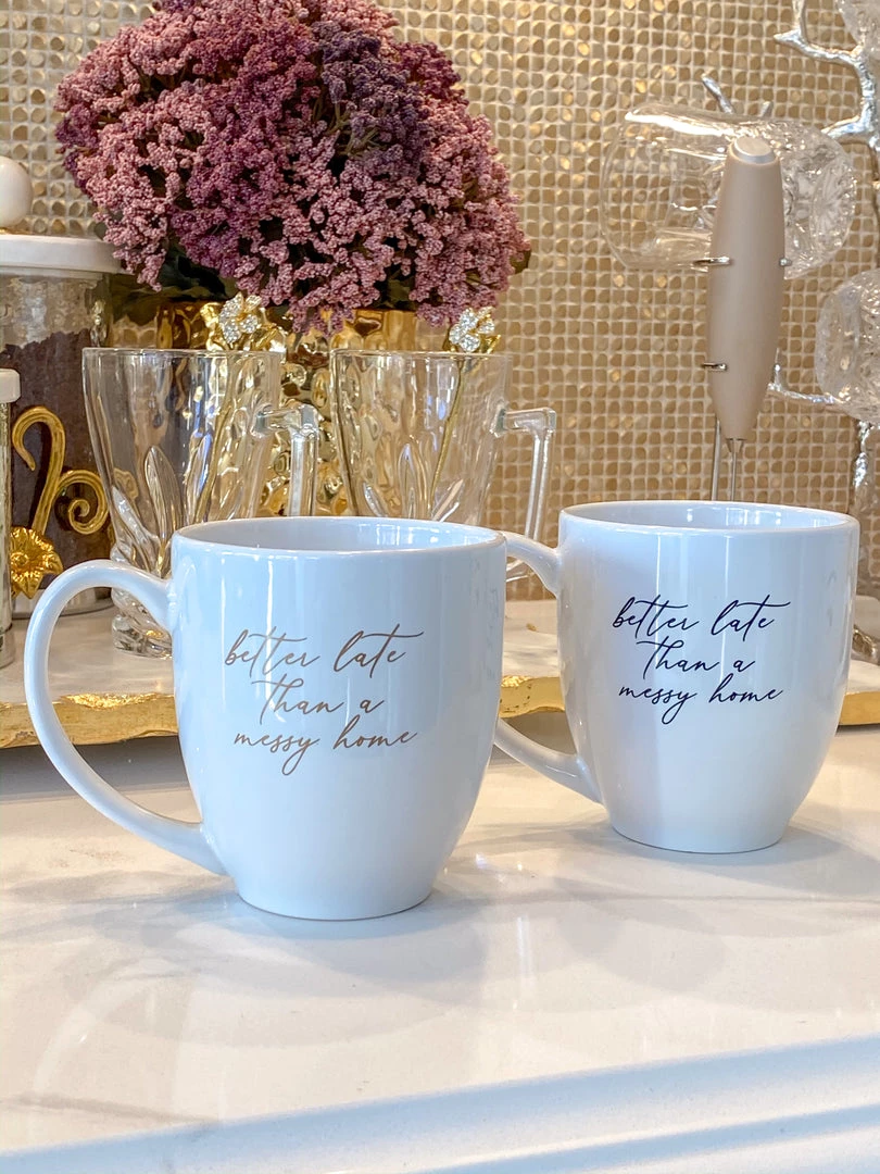 “better late than a messy home” white bistro mug. Choose between gold and black text.