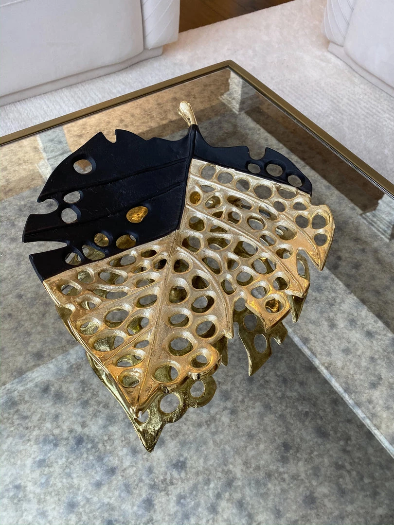 Description: This intricate black and gold leaf plate features a very unique design that will draw eyes! Display on your coffee table or on your kitchen counter, what a cool way to mix and match colors!