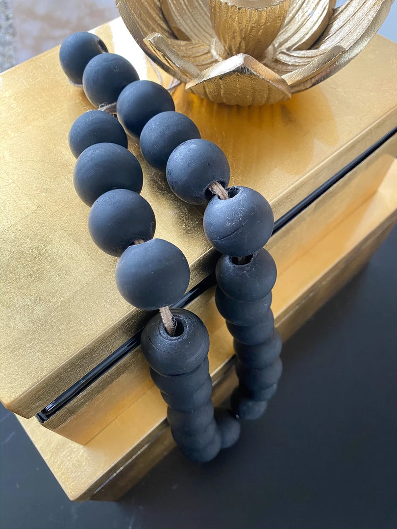 These lovely black beads are constructed of glass and feature a matte finish. They are perfect to style on a tray with your favorite decorative coffee table books, or with a nice vase.