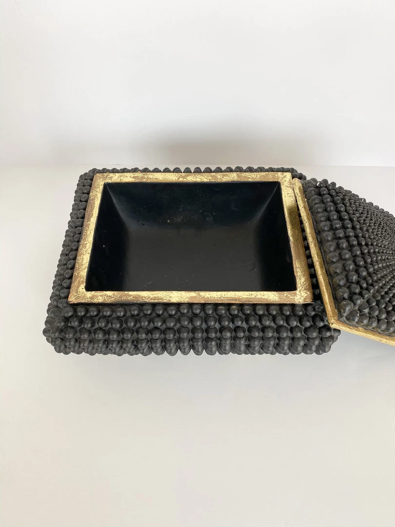 This black studded box is absolutely stunning! The gold detailing adds such a luxurious touch. Perfect for adding a bit of elegance to my living room decor.