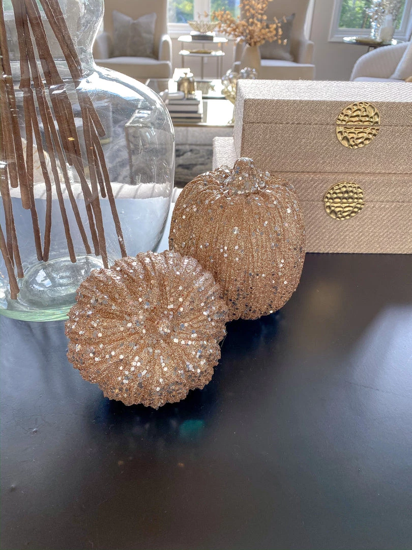 Description: This champagne colored pumpkin is covered in glitter and will add glam to any fall decor vignette.