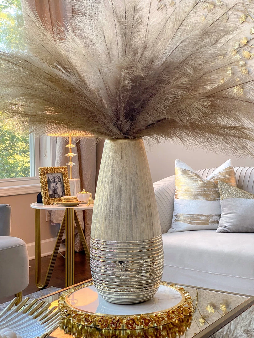 Description: This stunning vase will be a beautiful statement piece in your home! The bottom features stands of glossy finish while the rest is a speckled textured finished to create a unique and captivating design! Perfect for any season, this is a very substantial piece.