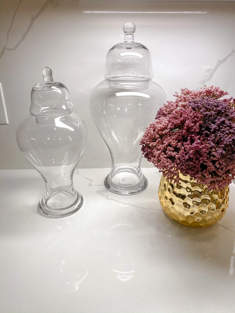 Description: These glass apothecary jars have a fun and interesting shape and are perfect to hold things or as a vase!