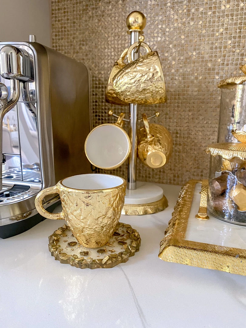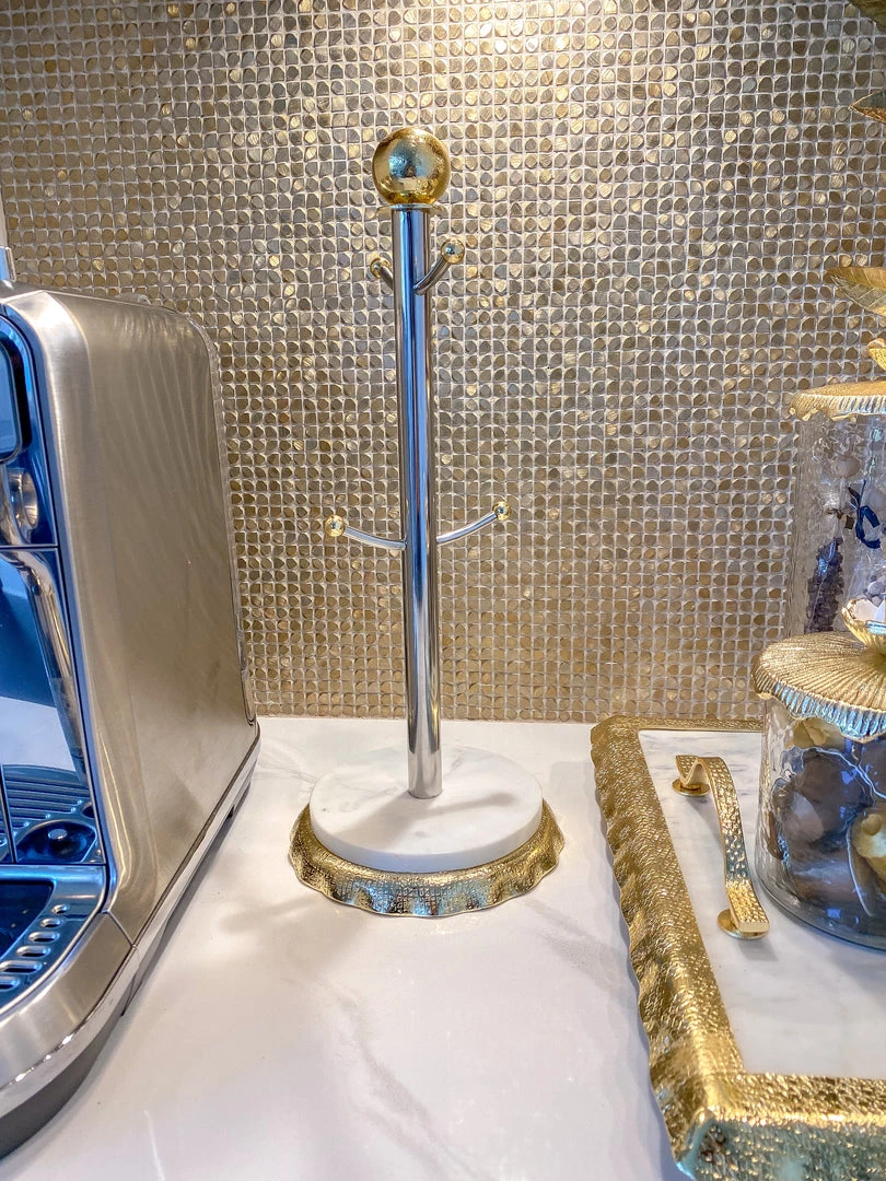 Description: Hold your mugs in style with this stunning mug holder! Able to hold up to 4 coffee/tea cups at once, this mug stand features a beautiful marble base and two-tone metal details to make this timeless and elegant. Will match any existing home decor!