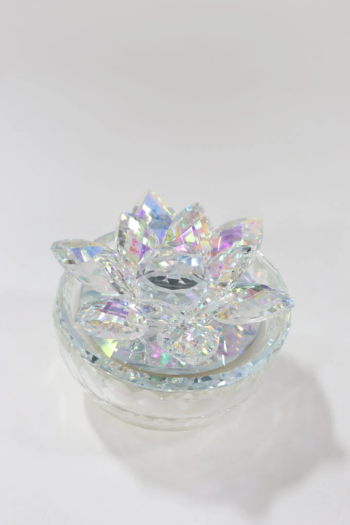 Description: This beautiful lotus crystal candle offers an elegant and unique way to light your home. Infused with the scent of fresh linen, this candle is sure to help you relax after a long day. Available in silver and clear crystal lids!