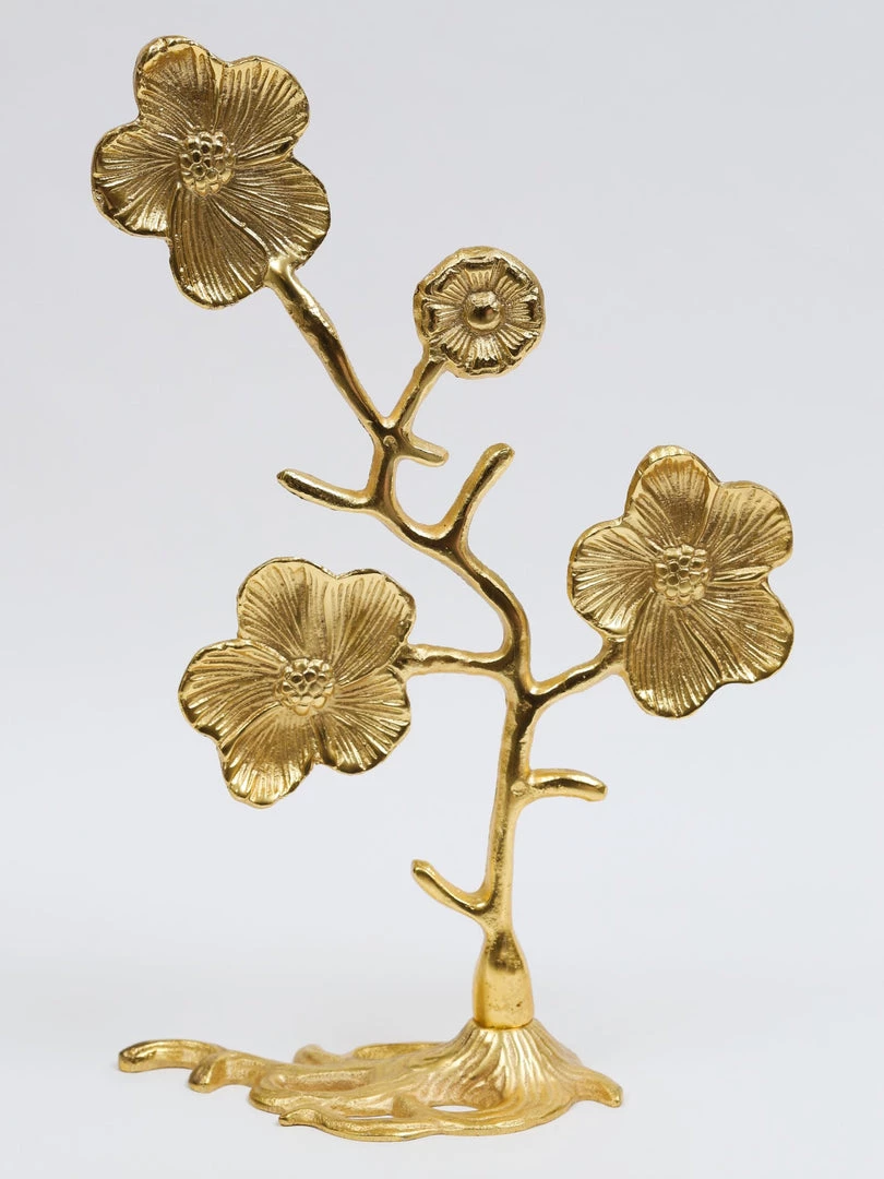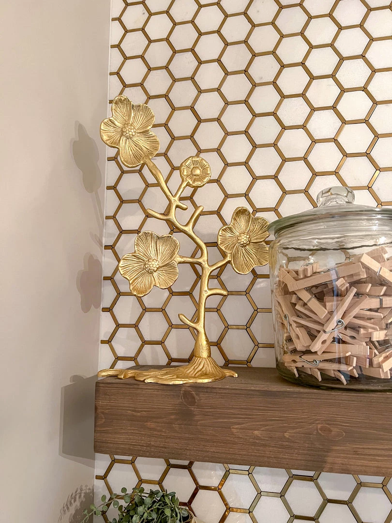Description: This stunning gold floral decor is great to add extra height to your vignette! Standing at 15.5″ high, the silhouette on this piece is absolutely striking!