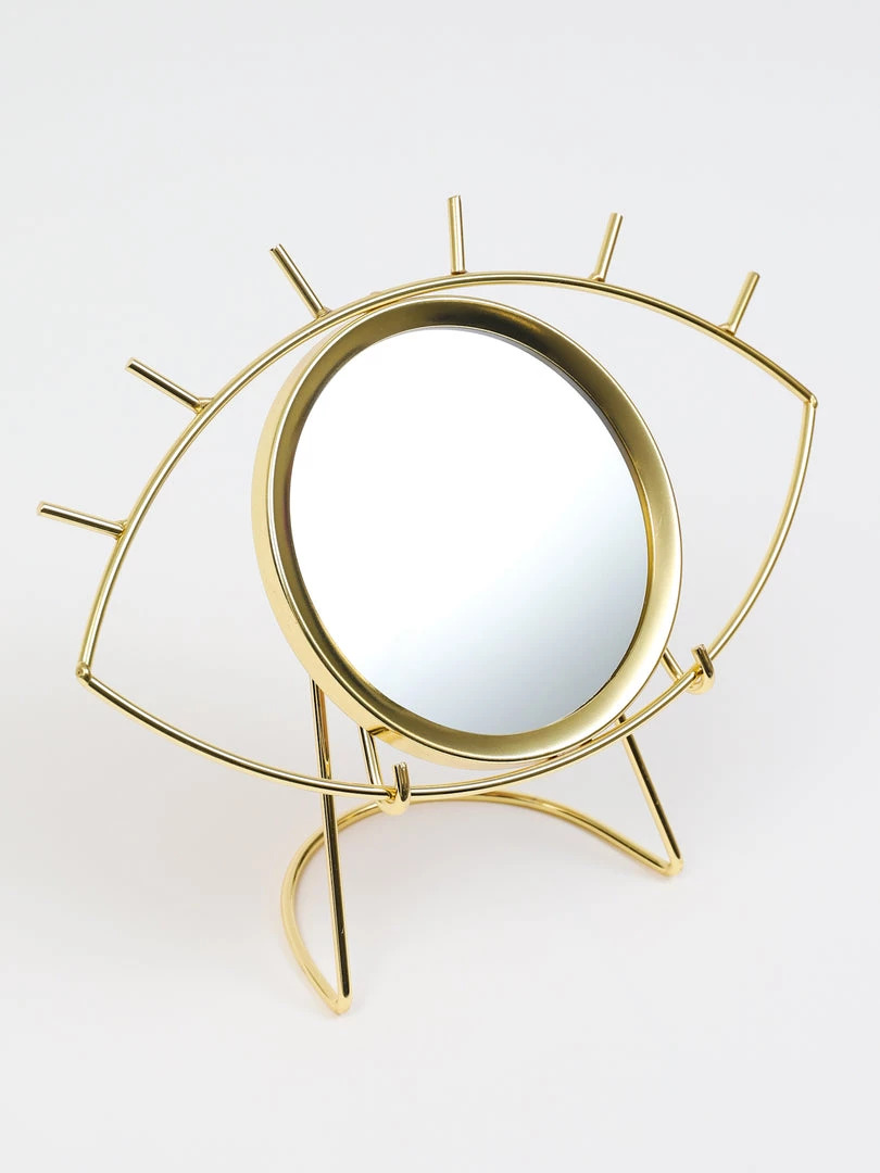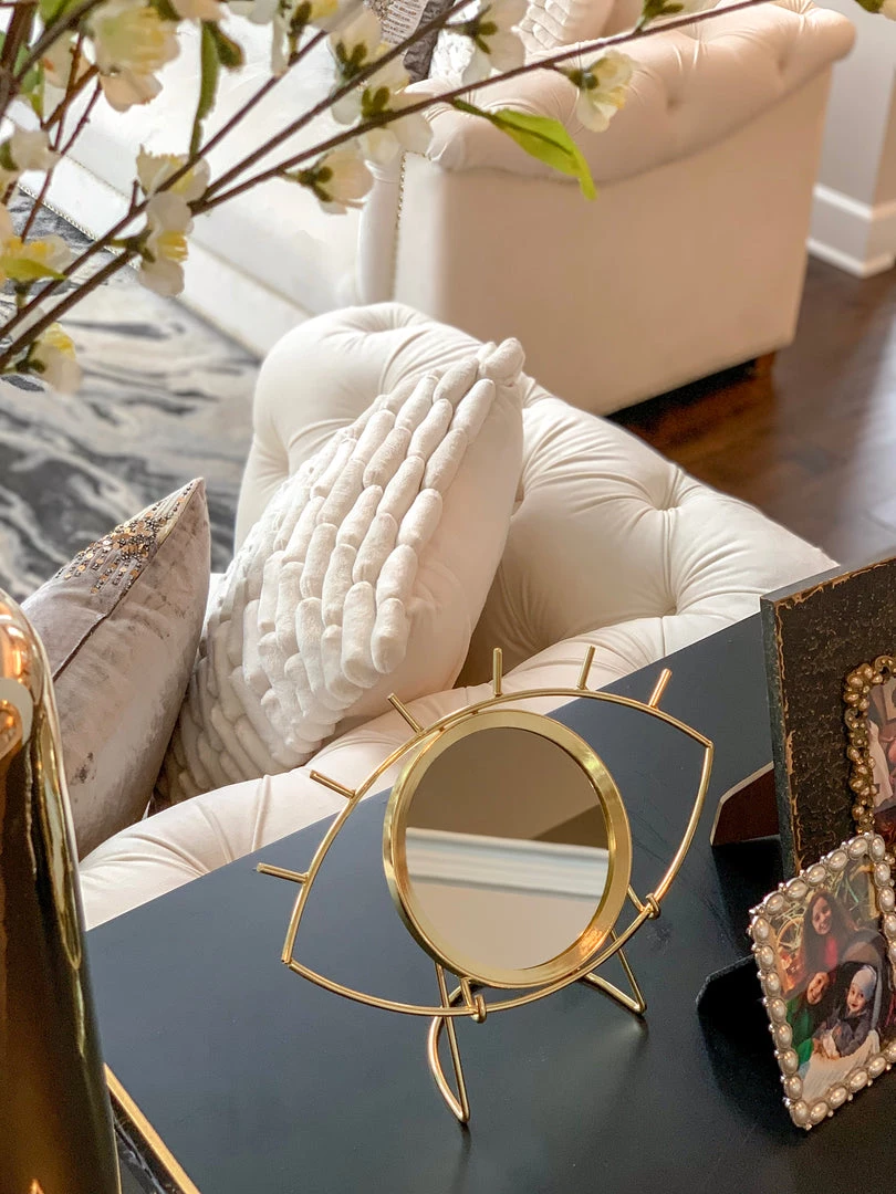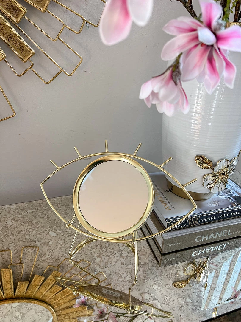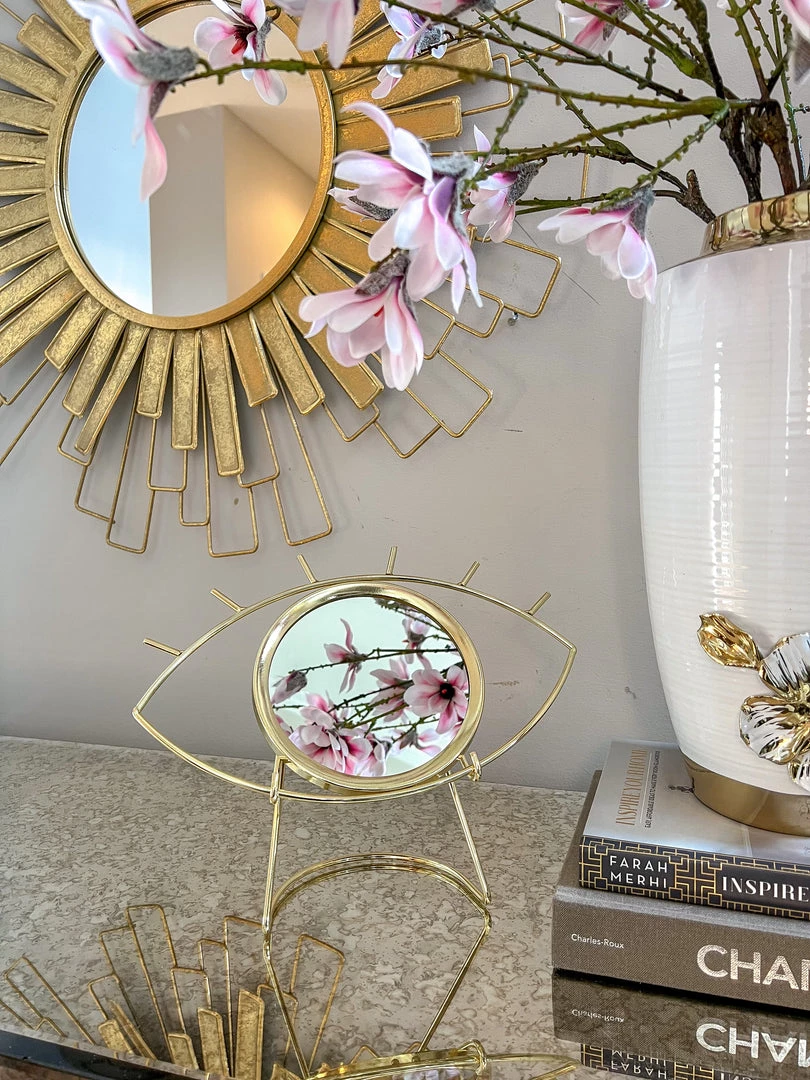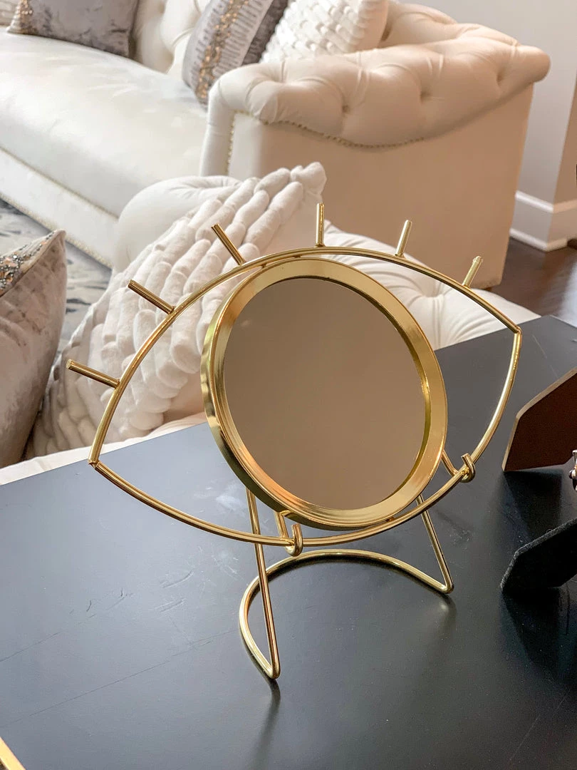 Protect your home from negative energy with this beautiful Gold evil eye mirror on a stand. Comes with the stand.