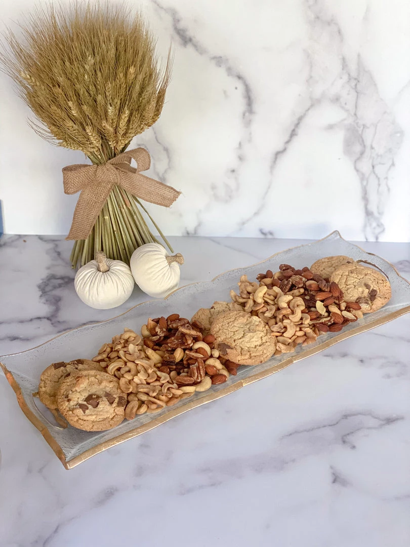 Description: Handcrafted glass serving dish with gold edging to add elegance to snacks and decor!