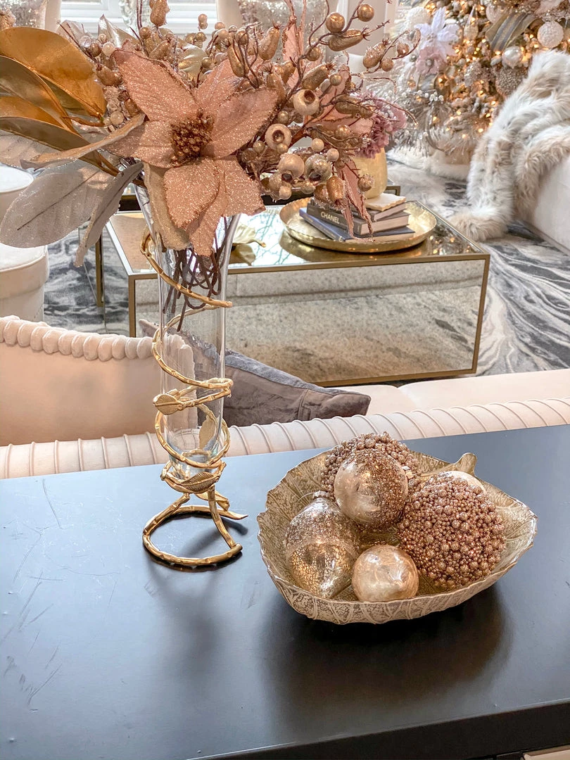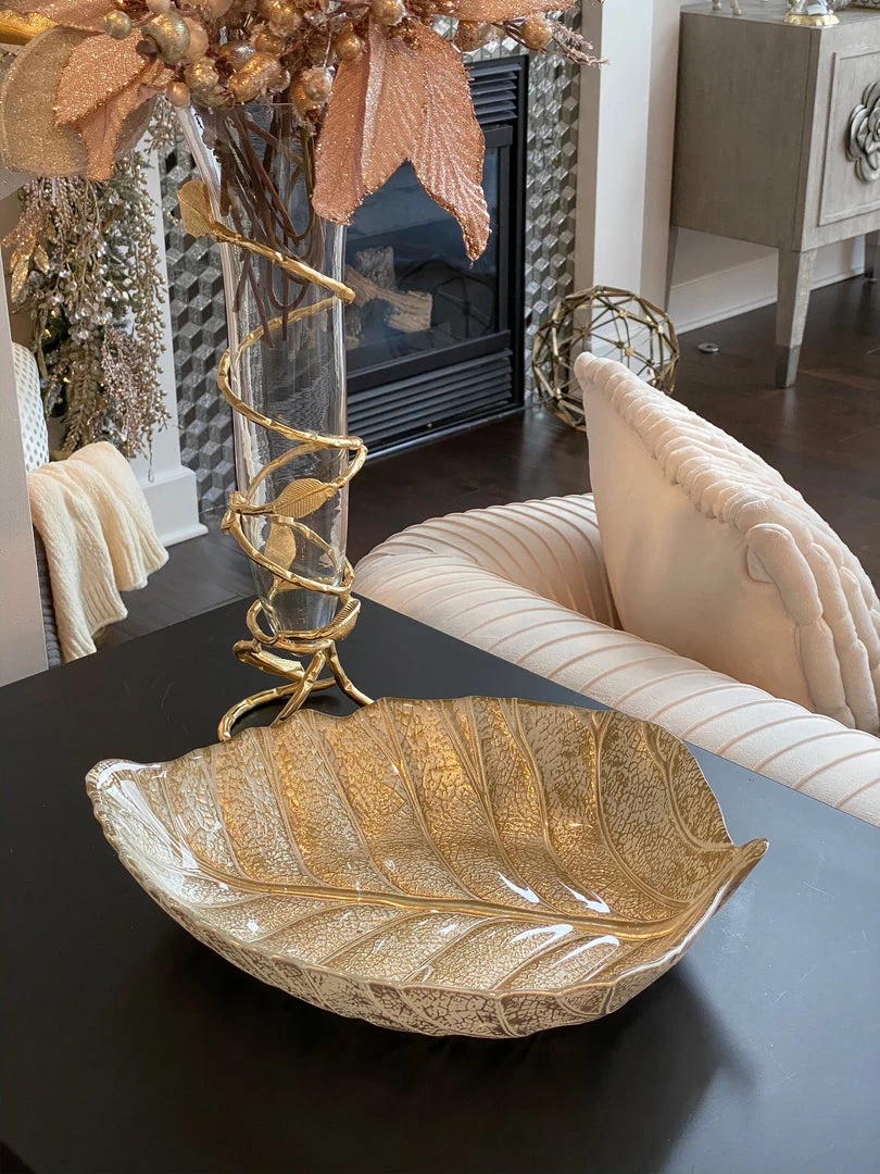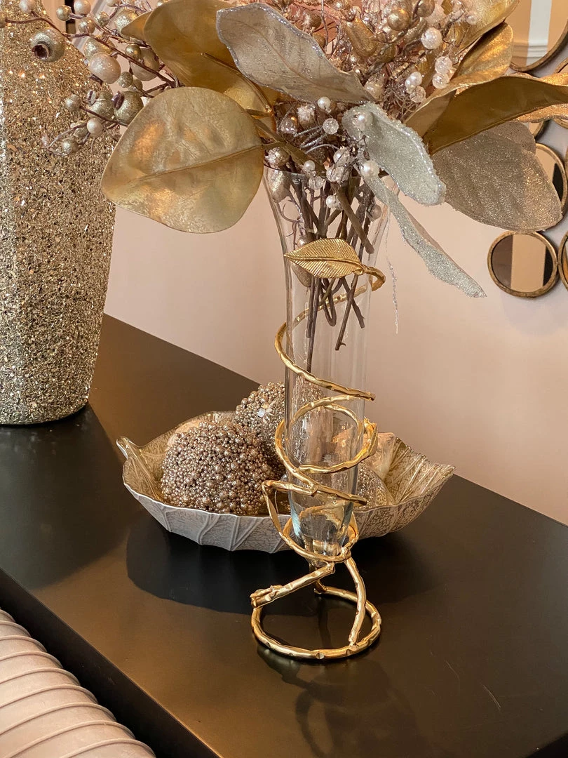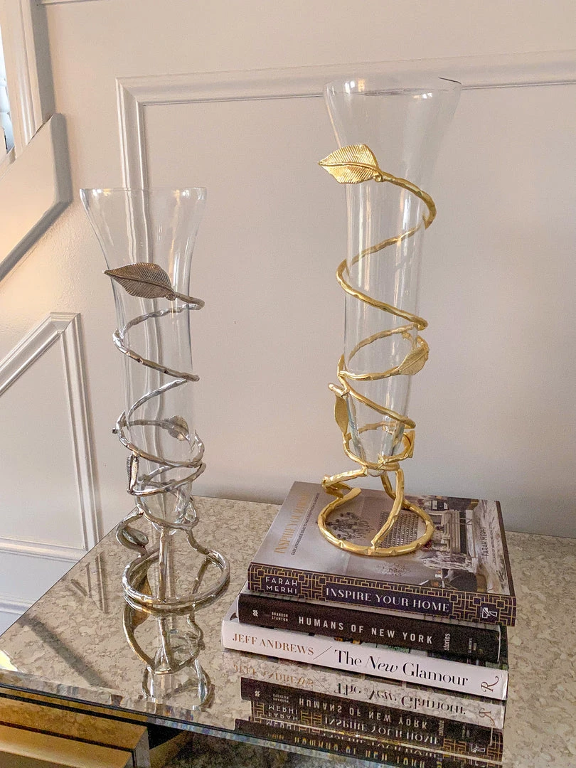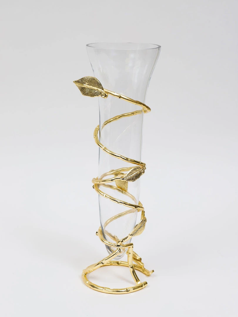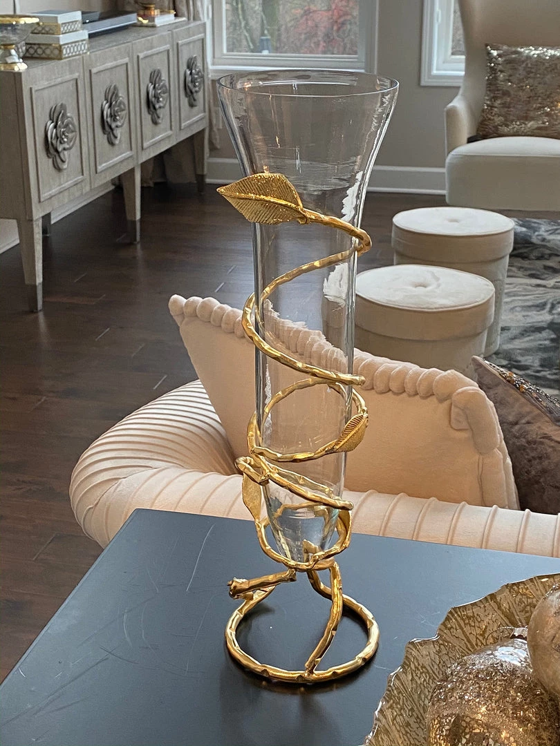 Description: Slim glass vase with stunning gold leaf design that adds a modern and expensive look to any bundle of flowers in any room.