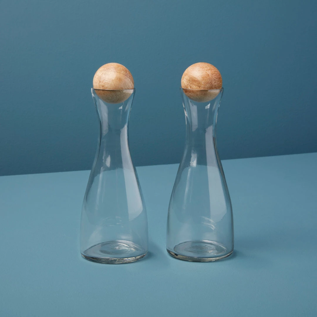 Description: These simple and sophisticated glass bottles are a beautiful display piece! Stlist and functional, these vases are food safe! Stopped off with a wooden sphere stopped, this is the perfect combination of rustic and elegant. Set of 2!