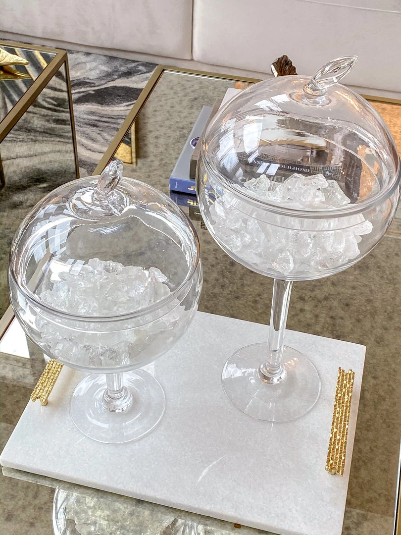 These apple stem jars can be styled as a set or on their own. They can be filled with candy, snacks, or even left empty! Farah has them styled with beautiful crystal stones and crushed gold glass!