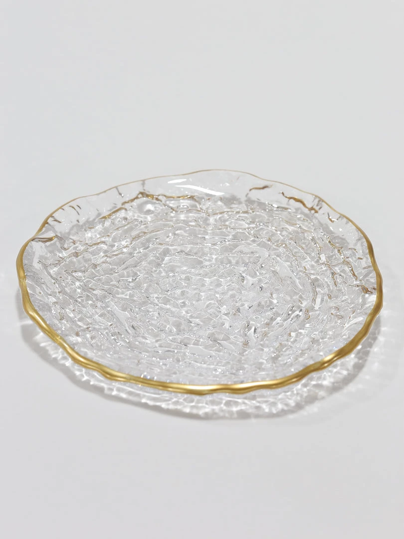 Description: This salad plate features beautiful textured glass and a delicate gold trim to add to your serving experience! Use it to serve your favorite snacks or as a base to display for your beautiful home decor accessories!