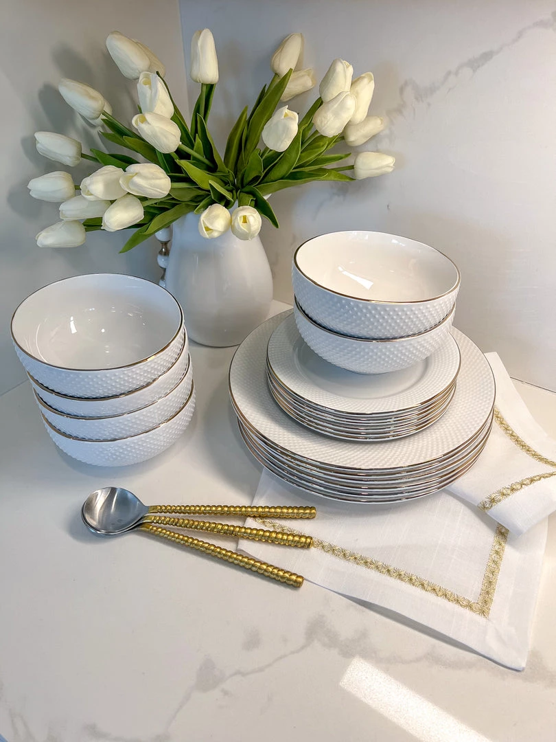 Description: This dinner set features a pique criss cross texture with a gold border. It includes 6 sets of dinner plates, salad plates, and soup bowls.