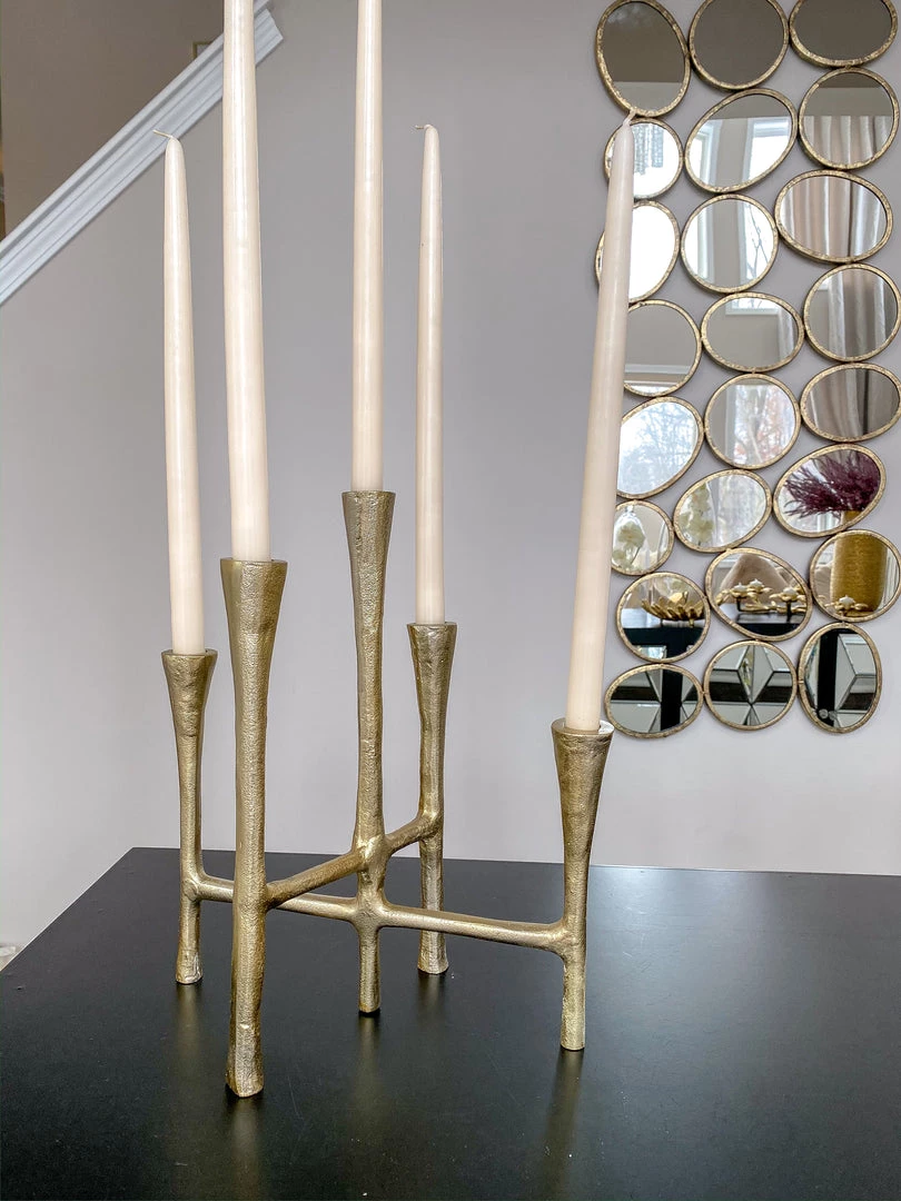 Description: Add a fun new twist to your candle displays with this beautiful candle holder! Able to hold up to 5 taper candles, this candle holder features a textured gold finish and adds a fun new element to your table display!