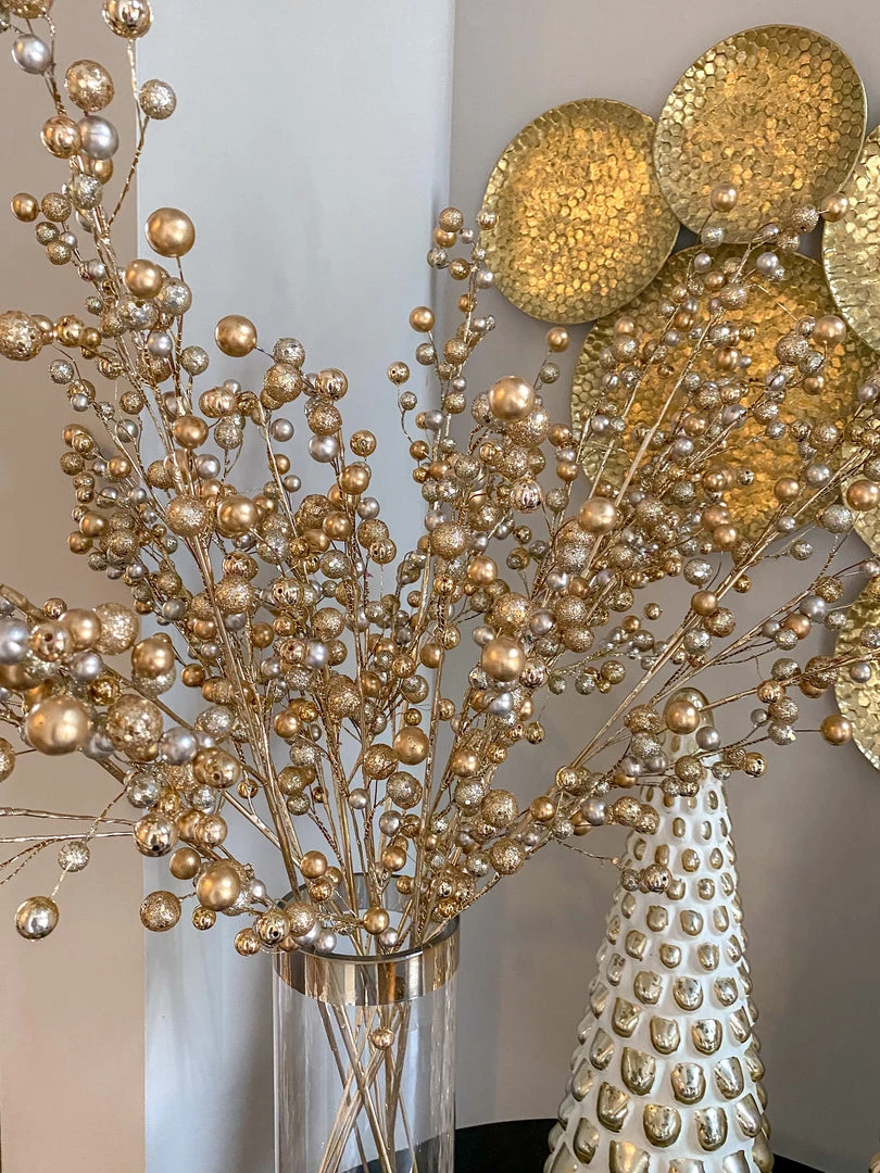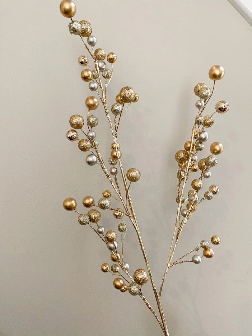 Description: This single stem of gold berries adds a unique and sparkling look to your Holiday display. *Priced for one stem*
