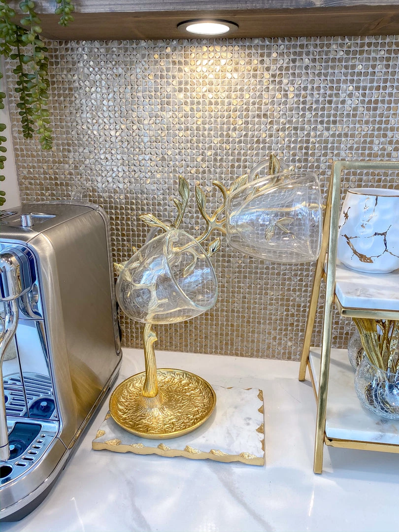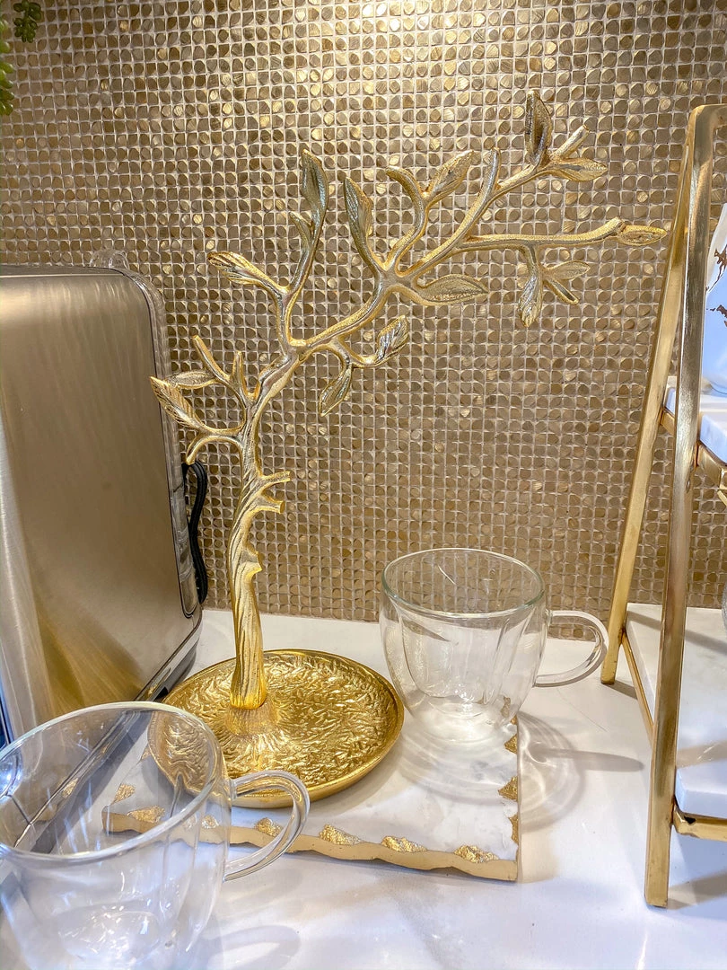 Description: This stylish golden branch tree transforms your kitchen display into an enchanted garden! Able to hold 2-3 small or regular sized mugs, this gold tree is a whimsical way to store your mugs!