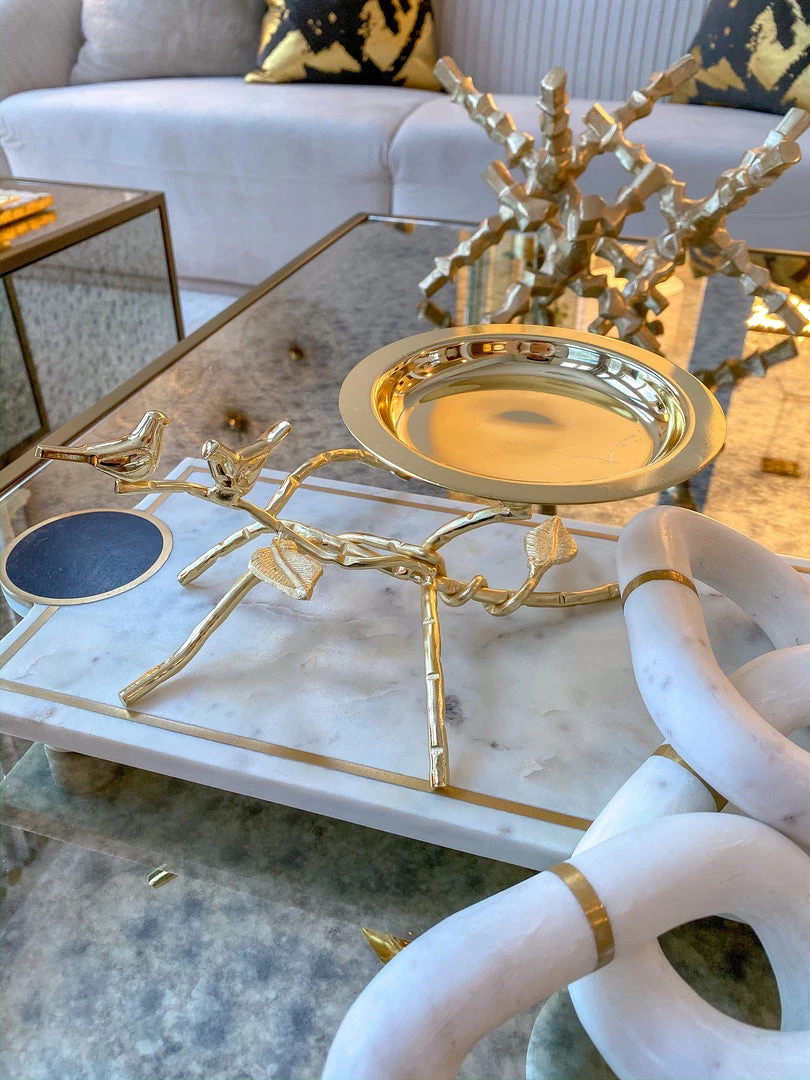 Description: This is the perfect centerpiece for our glamourous nature lovers! A little birds sits atop a delicate leafy branch besides a flat dish, which you can use to display anything you want! A candle, a small vase, even little figures would be beautifully accented on this piece. A great piece for a small dining room centerpiece! Available in silver and gold.
