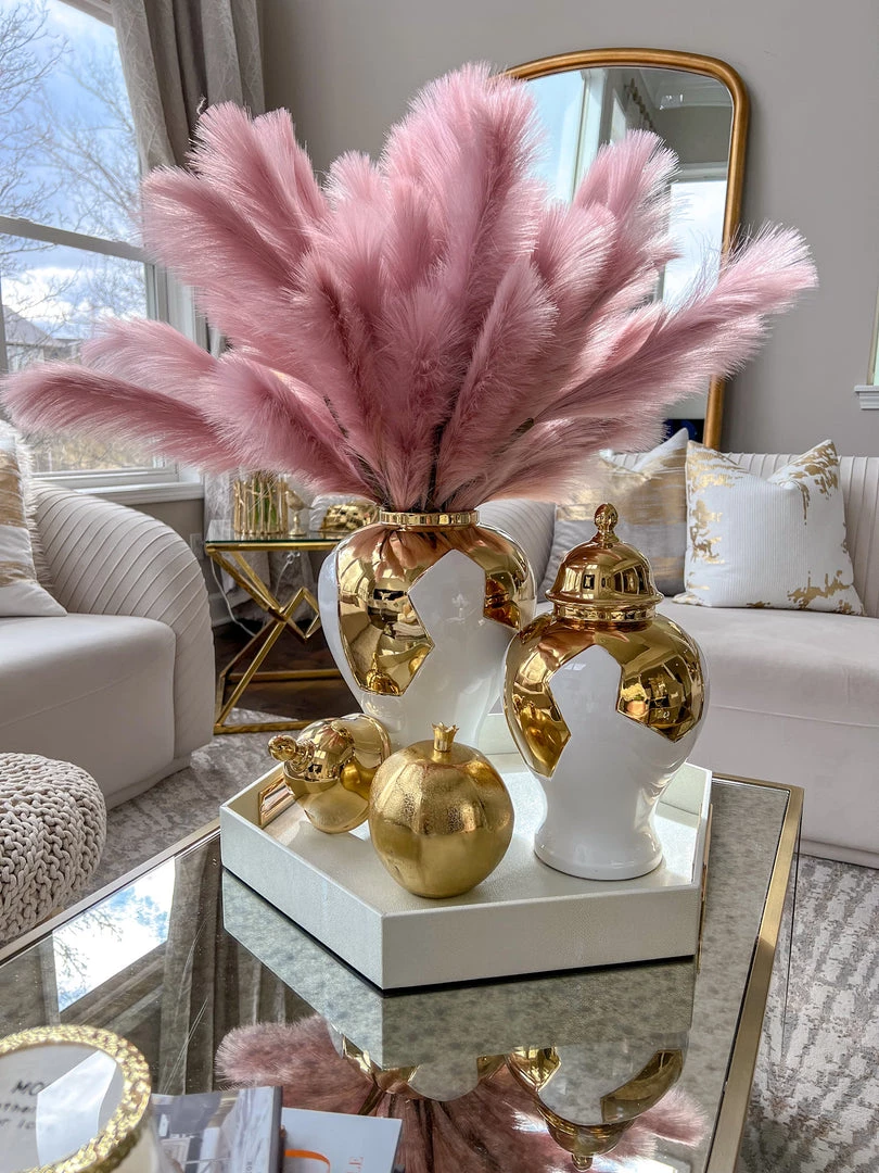 Description: These geometric white and gold ginger jars are a modern yet trendy way to decorate! Use them for your favorite faux florals or style them on their own!