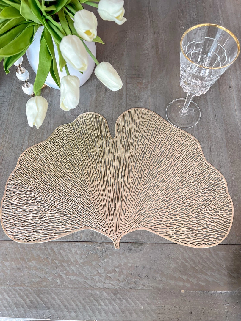 Description: This gold table mat features the shape of the Ginko leaf and is the perfect addition to your dinner table!