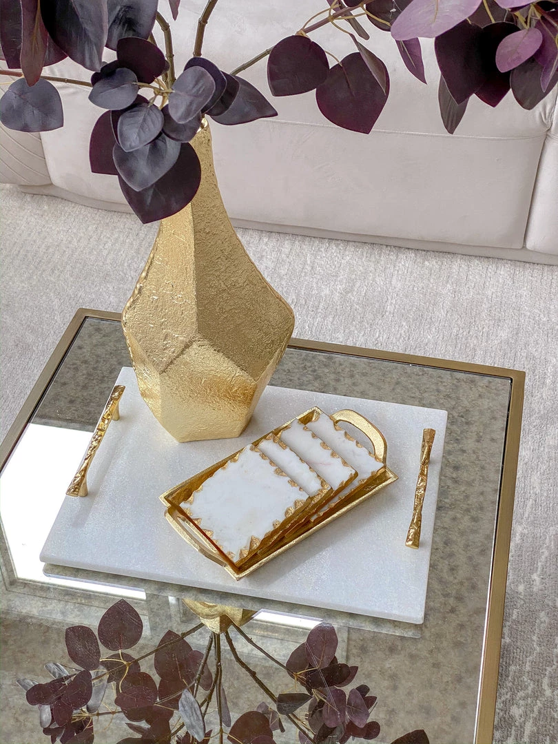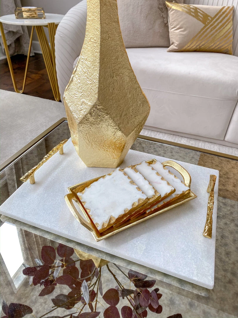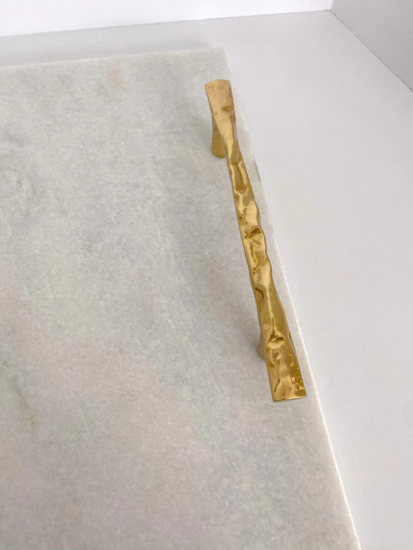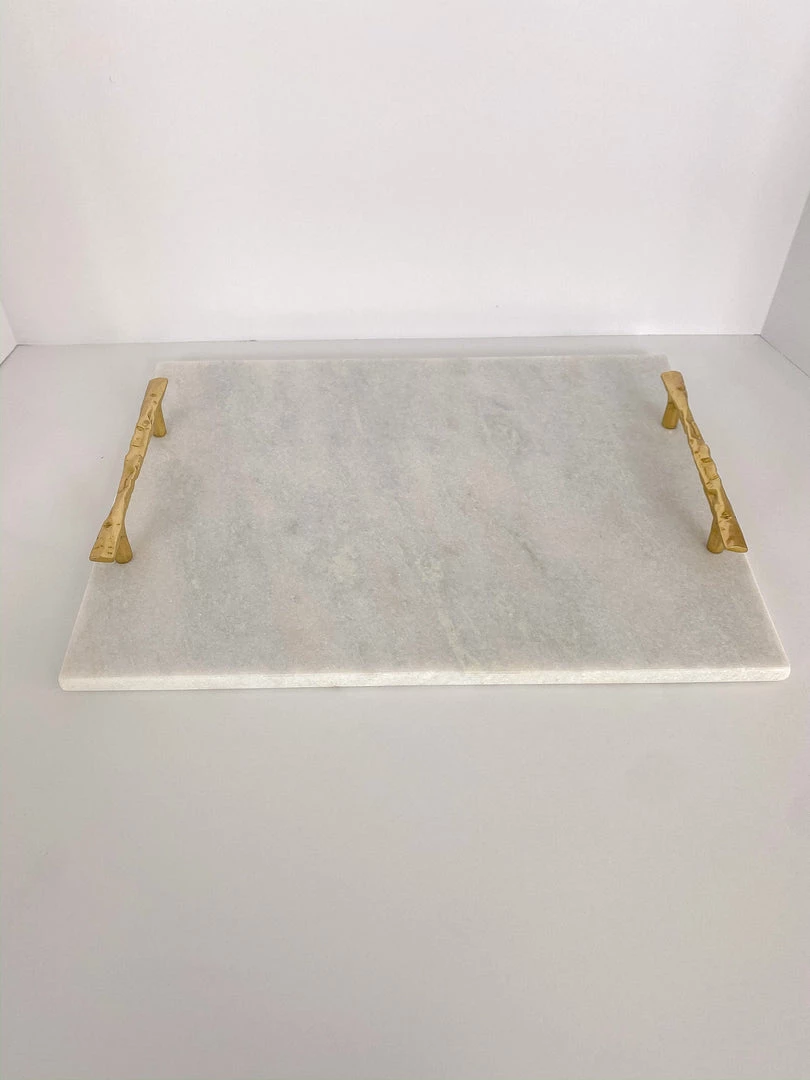Description: Serve your guests in style with this beautiful twig handle marble tray! Featuring gold handles and a matching serving knife, this piece is functional as well as stunning!