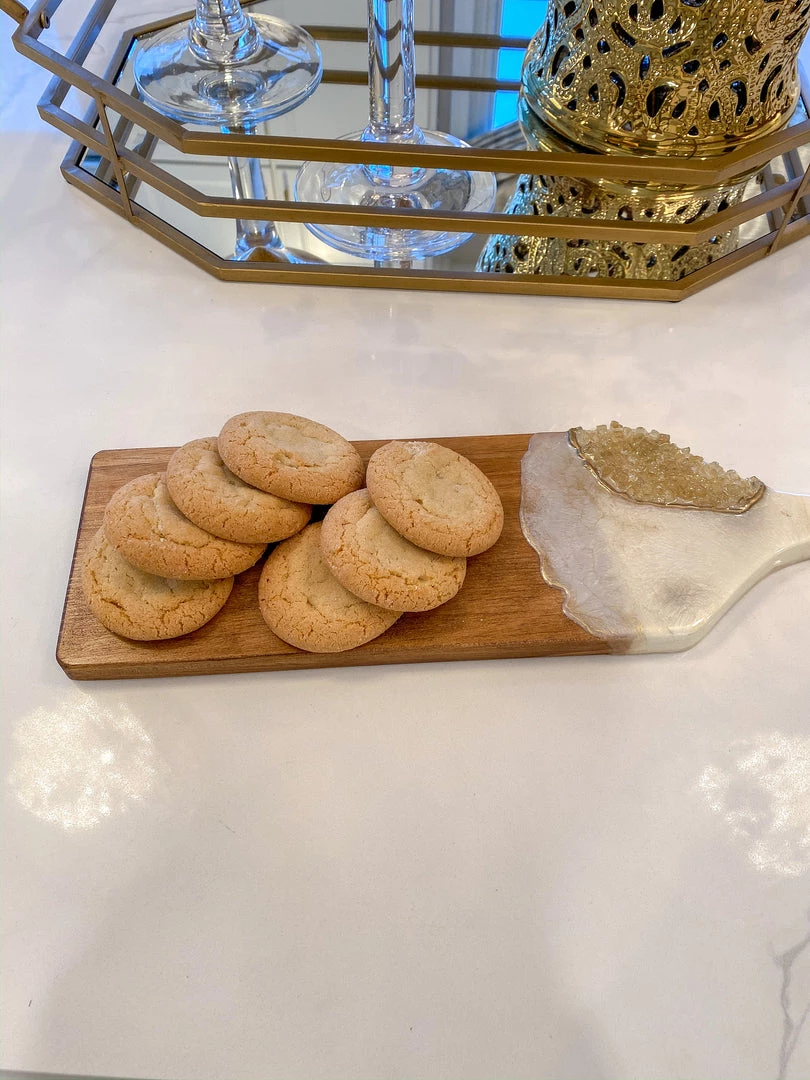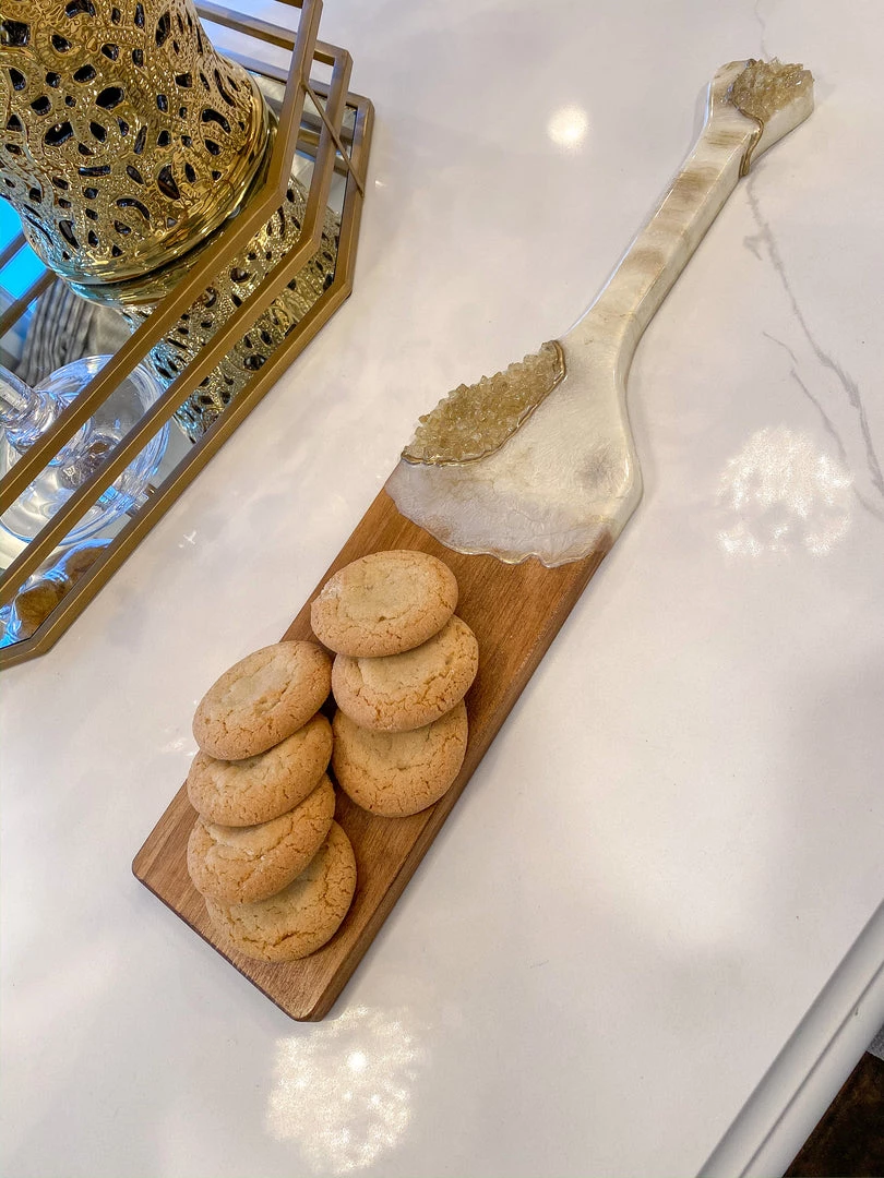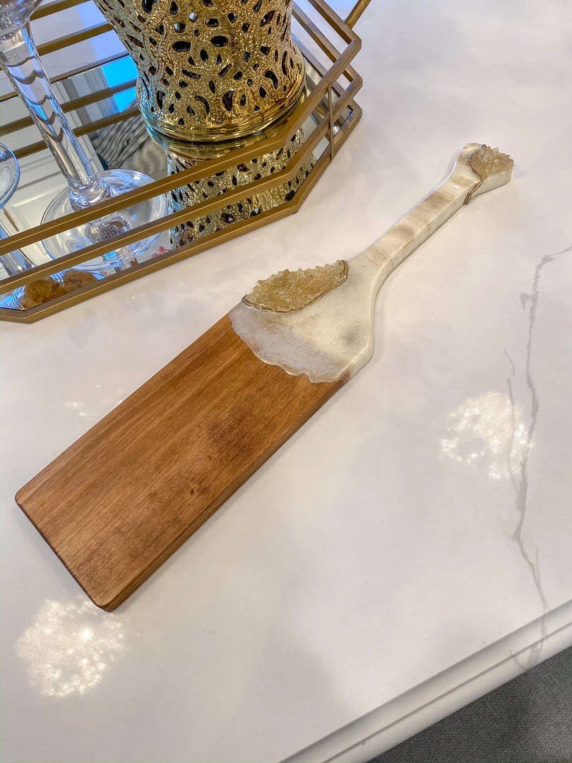 Description: This wooden paddle serving board will add a unique elegance to your serving display! Each piece is handmade with a glossy resin finish featuring gold and white colors and encrusted with clear shimmering stones.