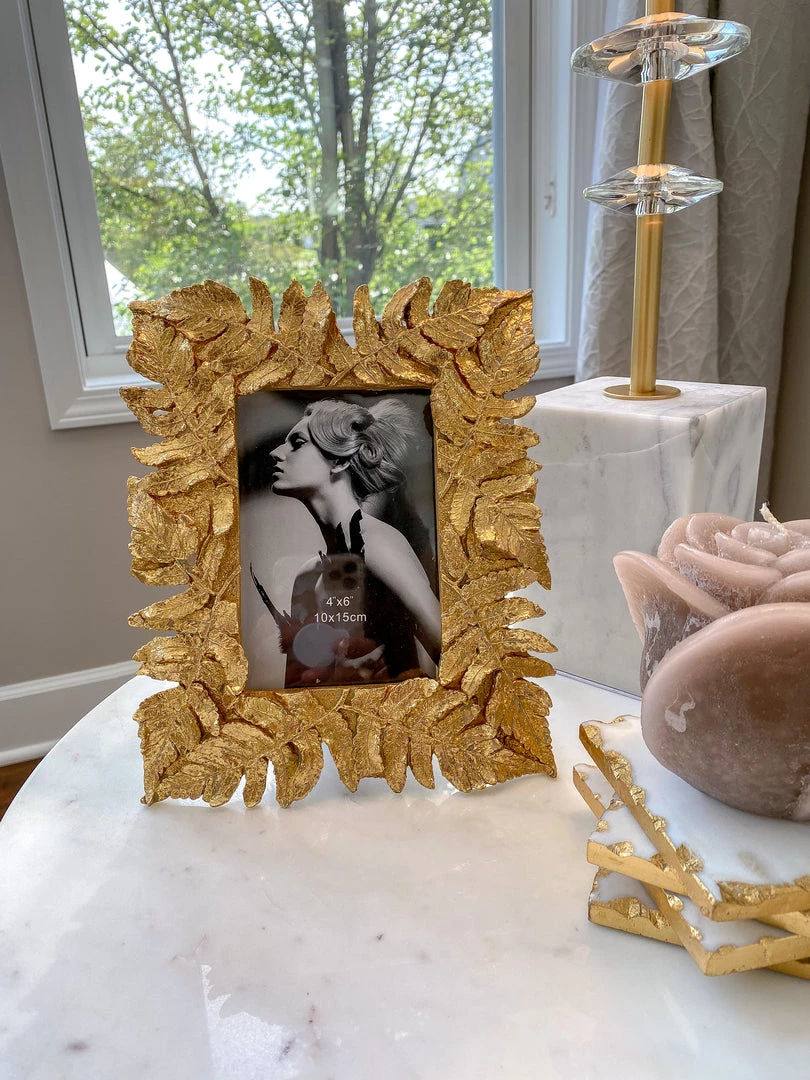 Description: This stunning gold leaf picture frame is a perfect accessories to highlight your favorite memories! The gold metallic leaves shimmer and offer a beautiful look for your home.