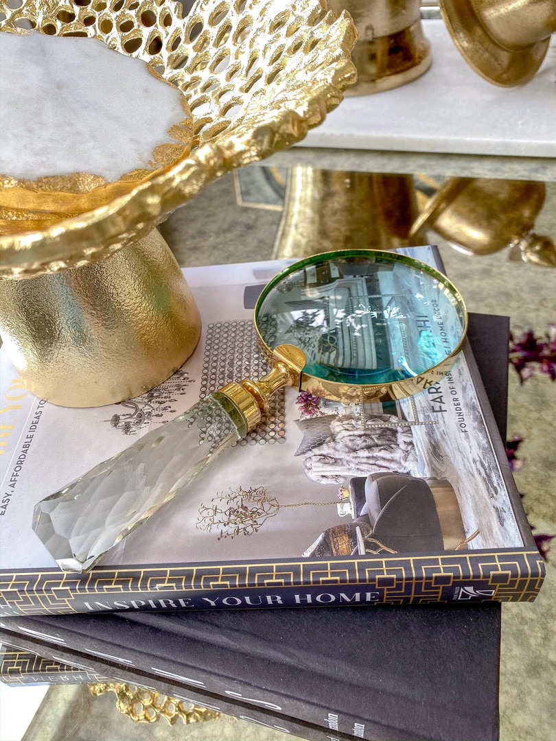 Description: This gold magnifying glass with glass handle adds glamour to your display.