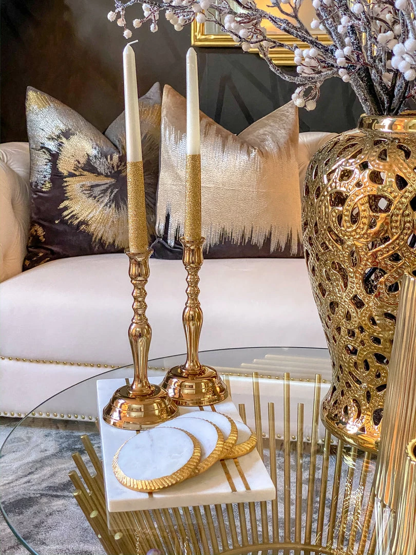 Description: Enchant your guests with this set of two beautiful candle holders. The glossy gold finish and classic design are fit for a glamorous dinner party or a romantic night in.