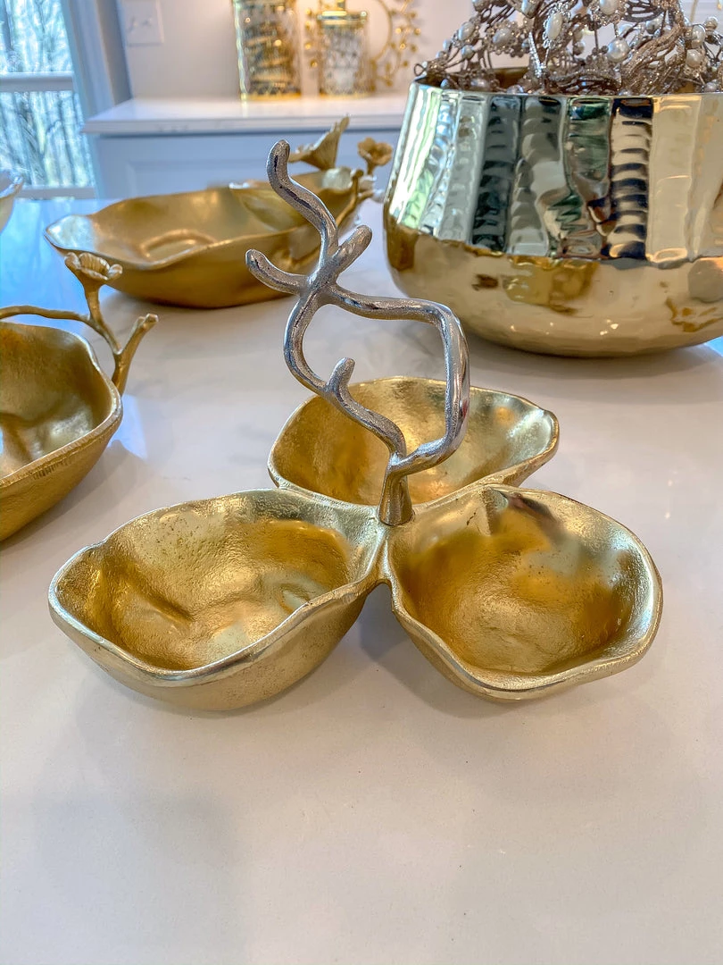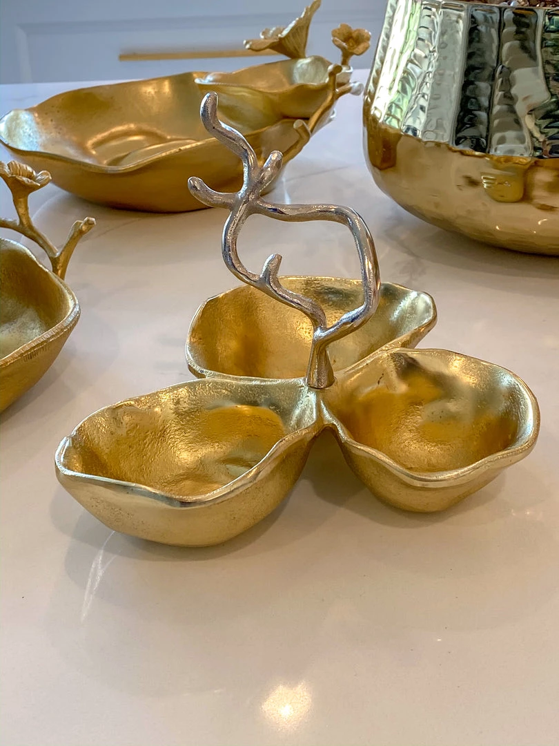 Description: This gold metal triple snack bowl is a stunning piece for entertaining or for everyday use and features a silver floral handle that threads into the center.