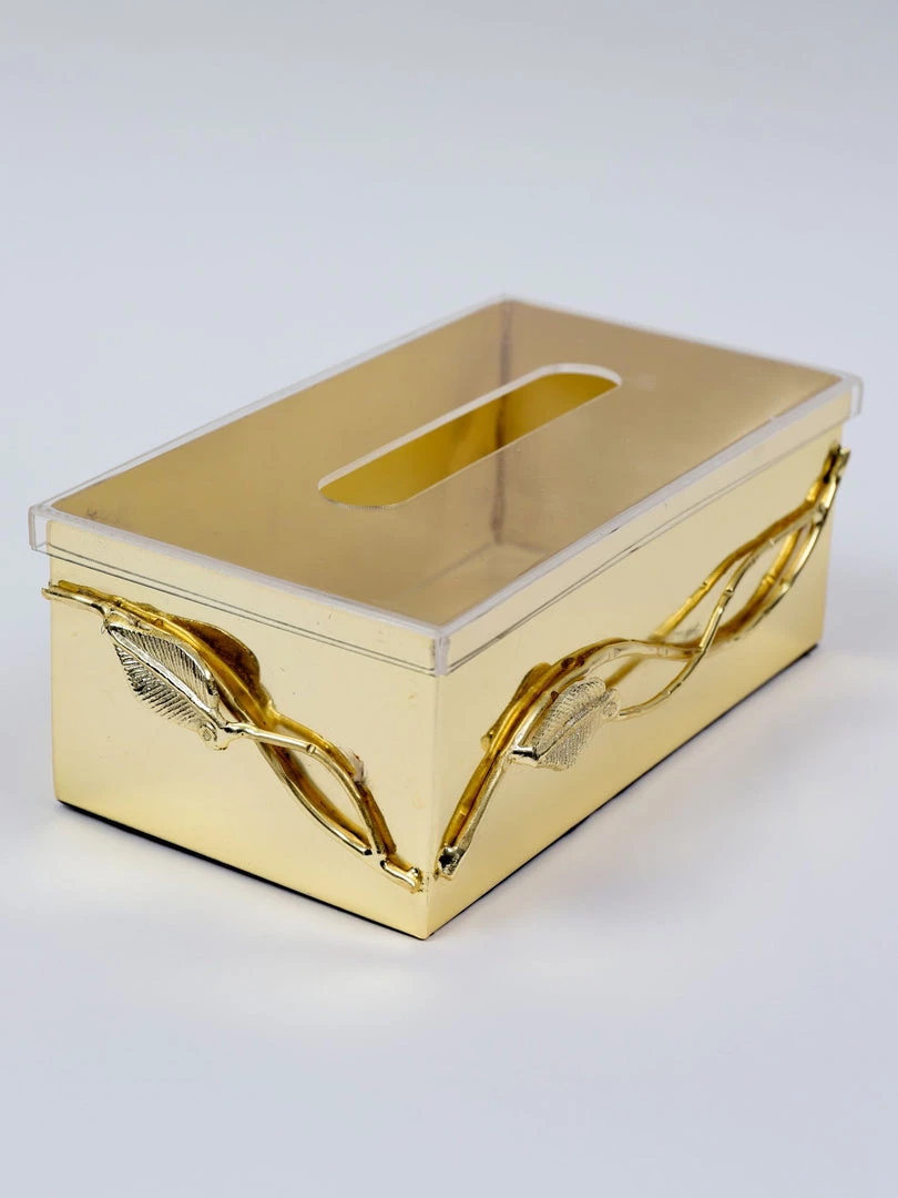 Description: This gold tissue box holder with its leaf design will hold and display your tissues while looking effortlessly glamorous.