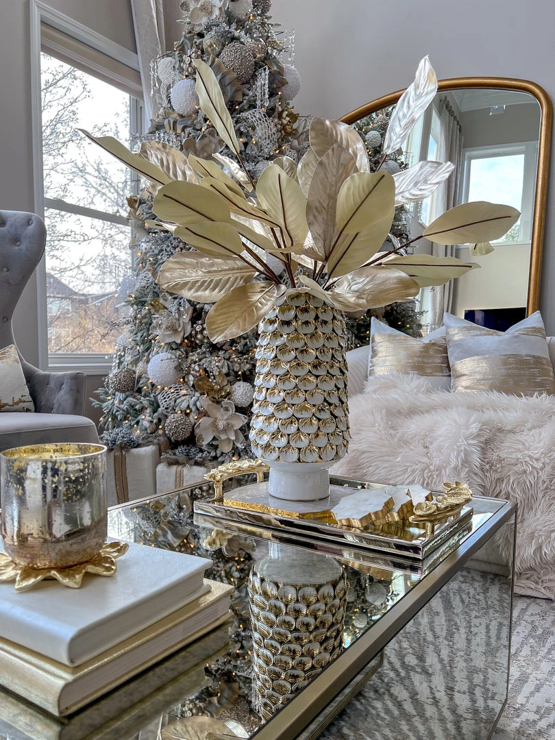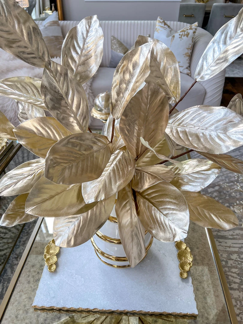 Description: This Gold Metallic Magnolia Leaf Stem will add a touch of glamour to your holiday displays or floral arrangements all year round!