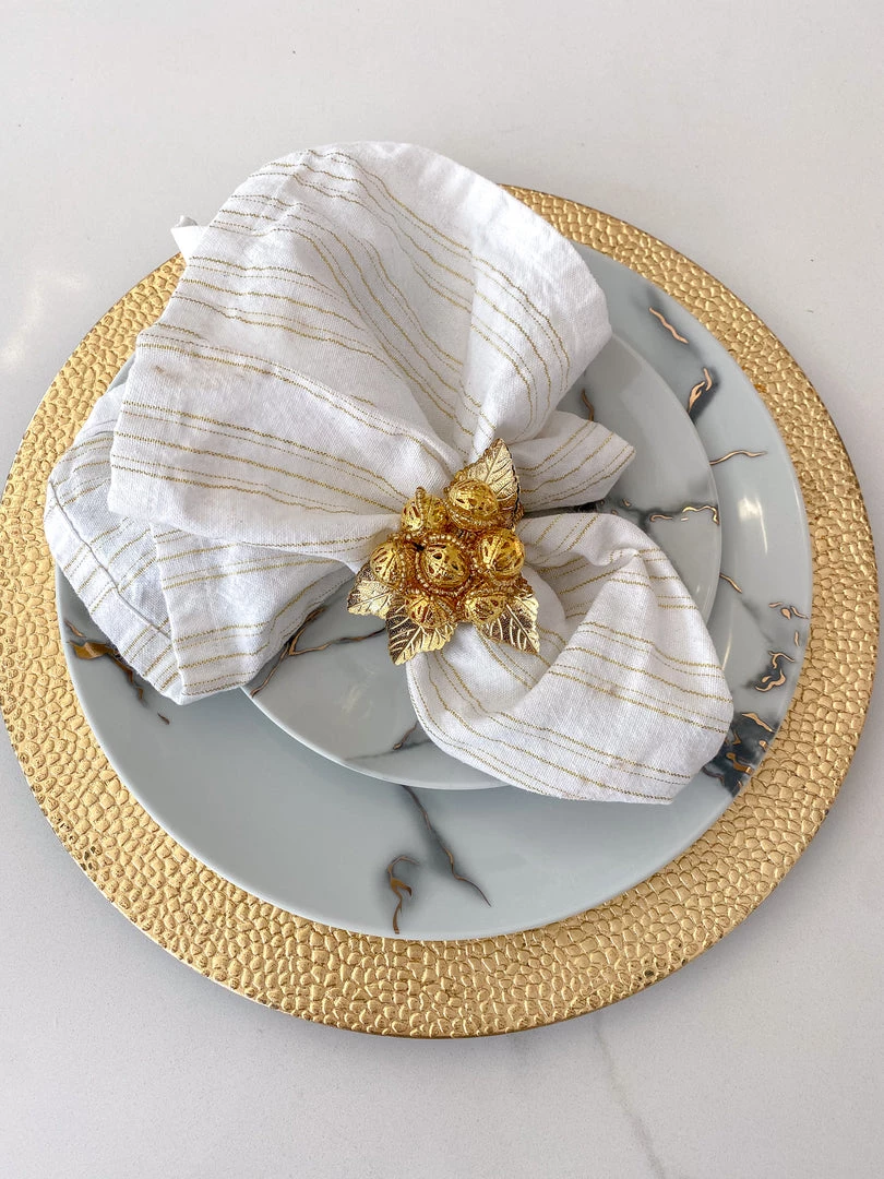 Description: These beautiful gold napkin rings feature gold orbs accented with delicate leaves for a beautifully finished look!