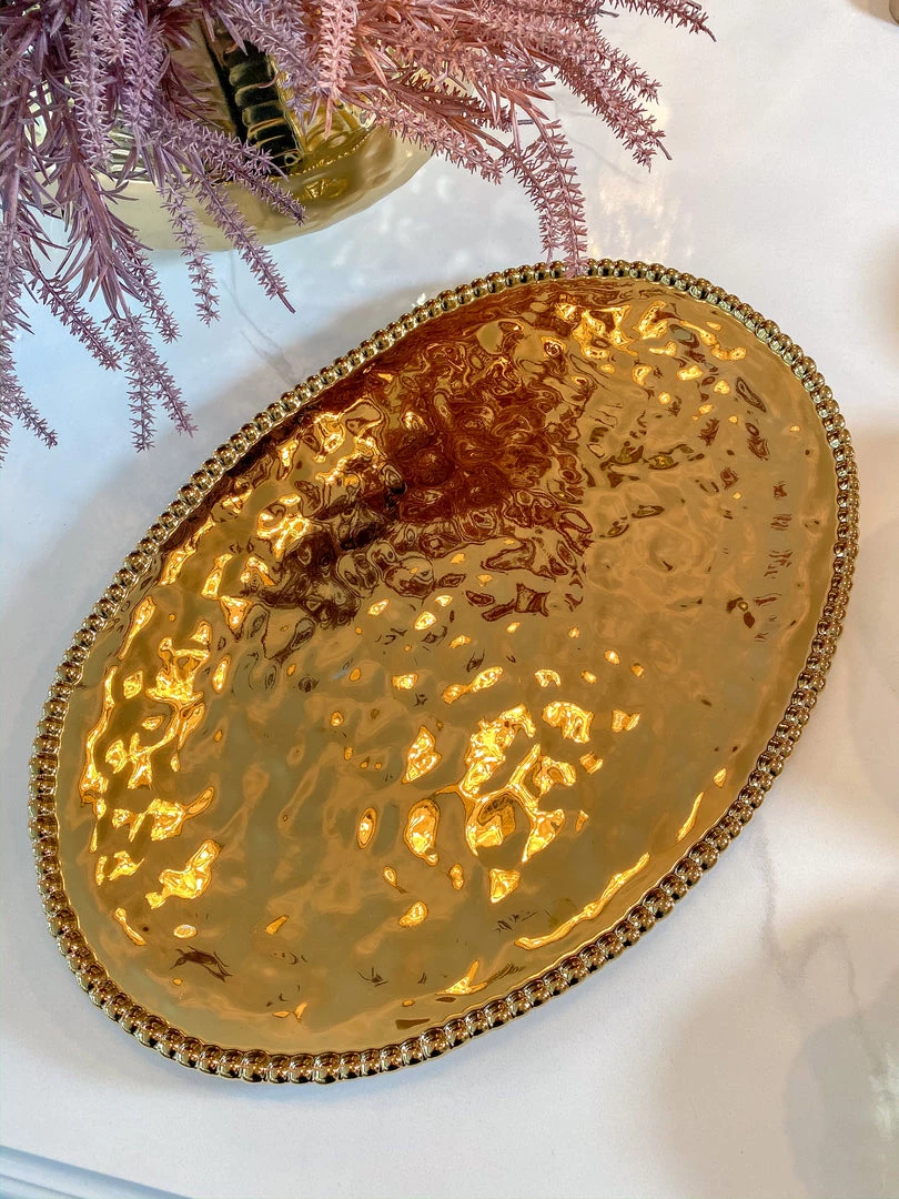 Description: This high quality porcelain is a miracle material! It is food safe, dishwasher safe, and oven safe up to 350 degrees! Made in Argentina, this beautiful porcelain is also tarnish free, scratch/stain resistant, will not lose its beautiful luster, and is perfect for everyday life! Baking and serving never looked so good! This oval beaded platter has a beautiful hammered texture and can be used for serving or for displaying your decor! Ties back perfectly to our other gold beaded porcelain items.