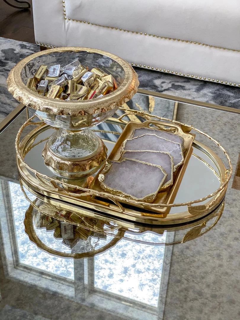 Simple yet fancy mirrored tray with gold leaf accents for a glamorous touch!
