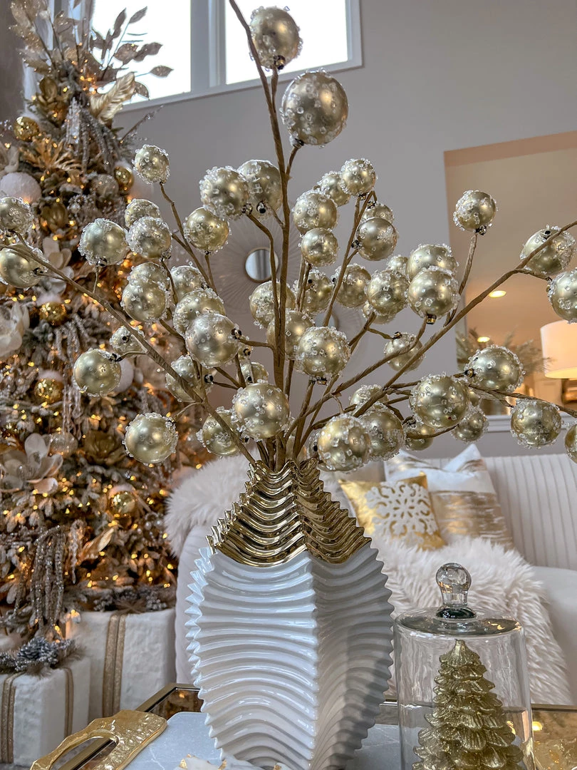 Description: Look at this magnificent Gold Pearl Spray! Beautifully displayed in a jar or mix and matched with other faux florals! Add this exquisite stem to your holiday décor.