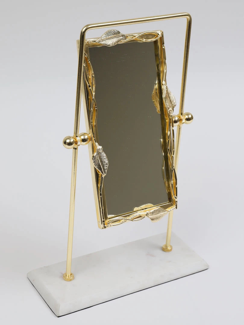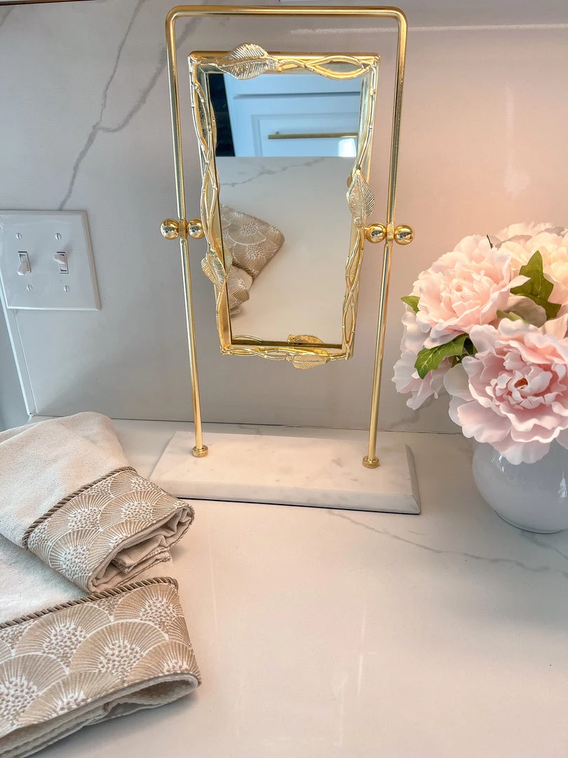 Description: This rectangular vanity mirror has a white marble base and will look stunning on your vanity or bathroom counter!