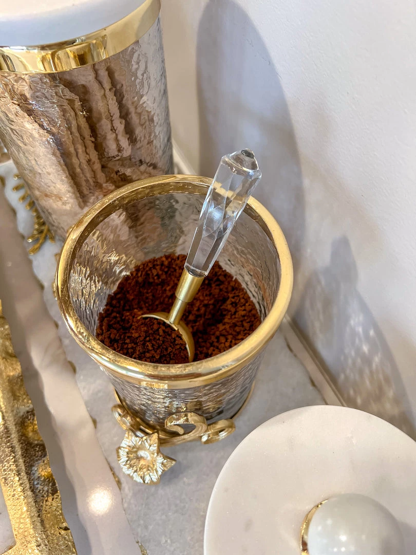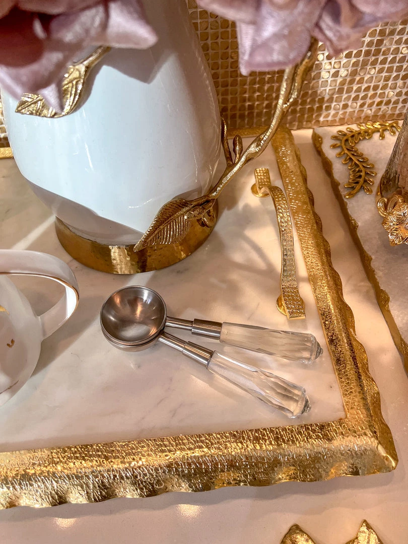 Description: This gorgeous deep gold set of four spoons features a sleek acrylic handle will add to your dessert or coffee station in such a stylish way!