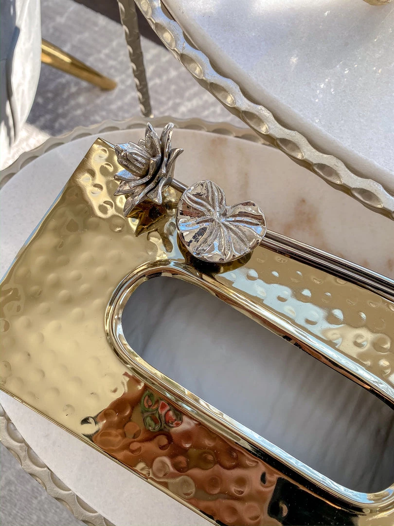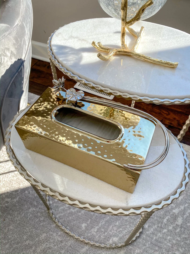 Description: This gold tissue box cover will hold and display your tissues while looking effortlessly glamorous.