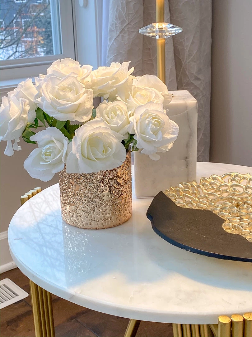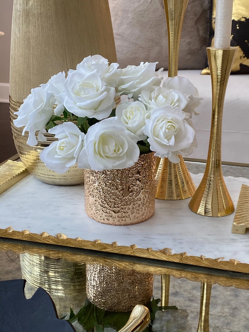 Description:This small gold votive is a simple and beautiful piece to have in your home! Display it on its own, or fill it with your favorite florals or treasures. Must have item!
