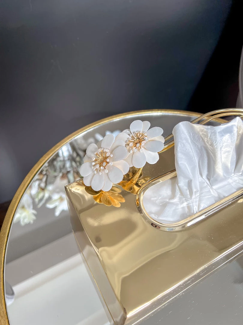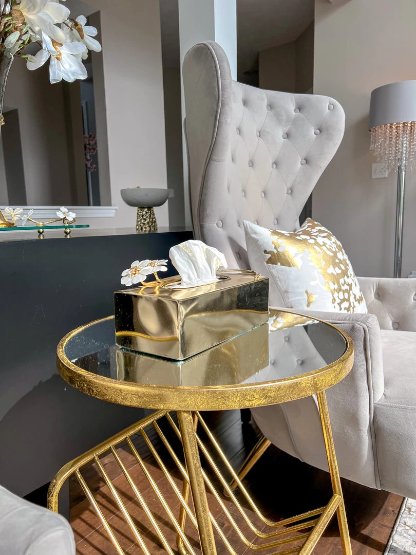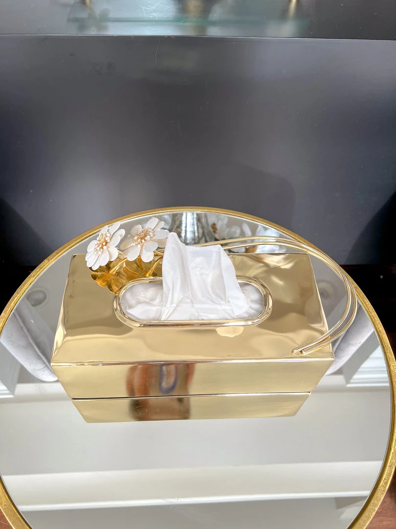 Description: Looking to elevate your tissue box! This gold tissue box cover features the white jeweled flower design and ties back to the entire collection.
