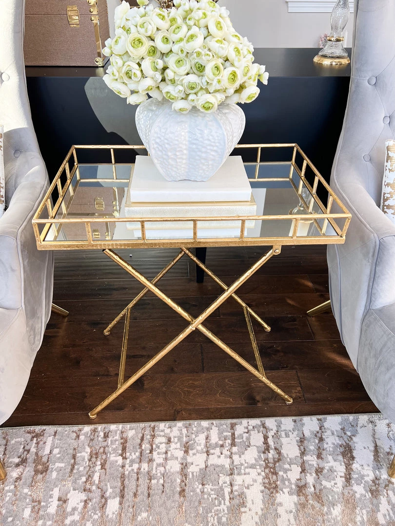 Description: One of our FAVS! We love the design of this gold tray side table. This easily folds down for storage. Use for a tea or coffee station. This is a gorgeous and versatile piece of home decor!
