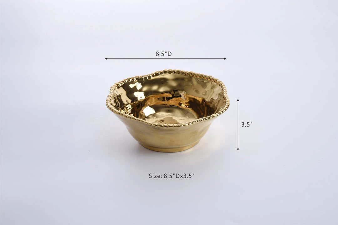Description: This high quality porcelain is a miracle material! It is food safe, dishwasher safe, and oven safe up to 350 degrees! Made in Argentina, this beautiful porcelain is also tarnish free, scratch/stain resistant, will not lose its beautiful luster, and is perfect for everyday life! Baking and serving never looked so good! This wavy edge beaded salad bow features a beautiful gold shiny finish and is very versatile. Ties back to all of our other beaded porcelain pieces. Comes in 2 sizes, Sold separately.