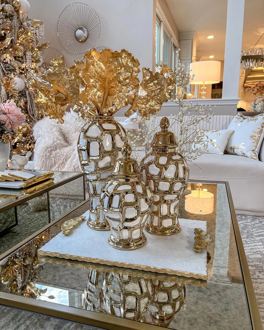 Description: Check out this white and gold Ginger Jar! This new style is a must-have! The white with geometrical dimensional gold detail is a timeless, statement piece! Use these Ginger Jars for your new focal point in your room! Available in 3 sizes.