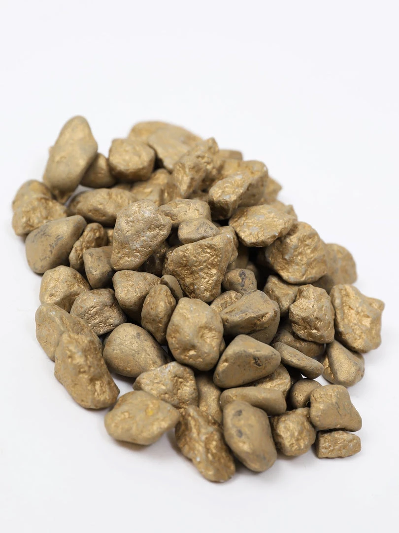 Description: These golden pebbles will add a pop of color and texture to any floral arrangement. They are perfect to add layers at the base of a vase or to nest pillar candles.