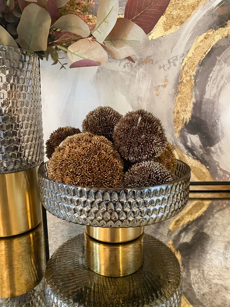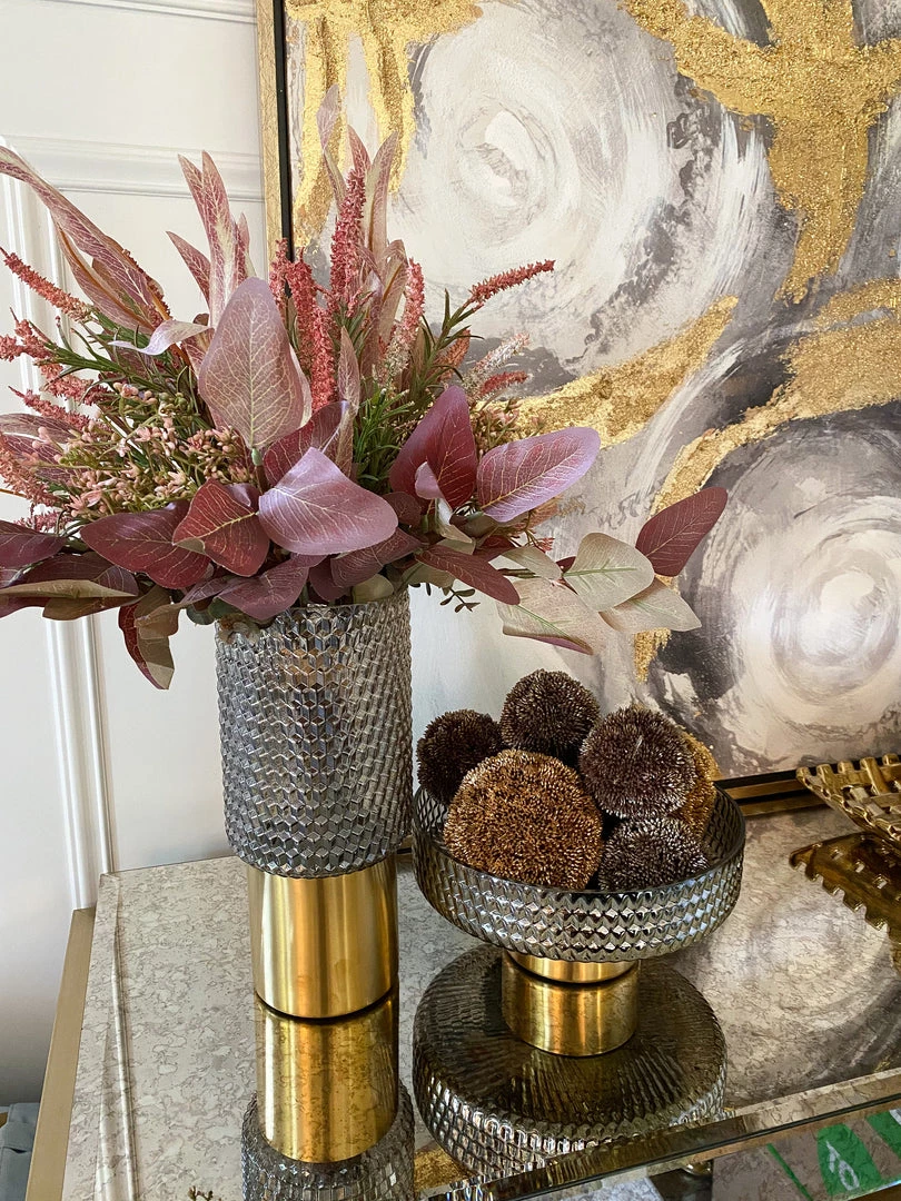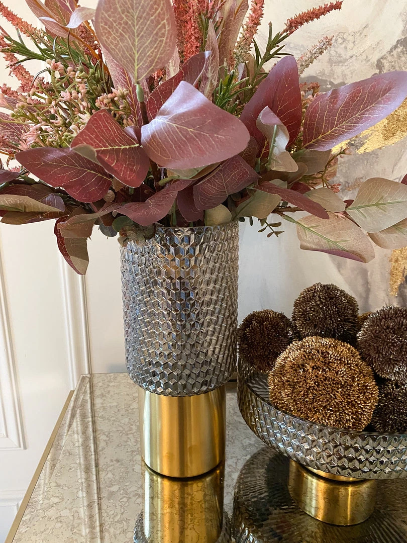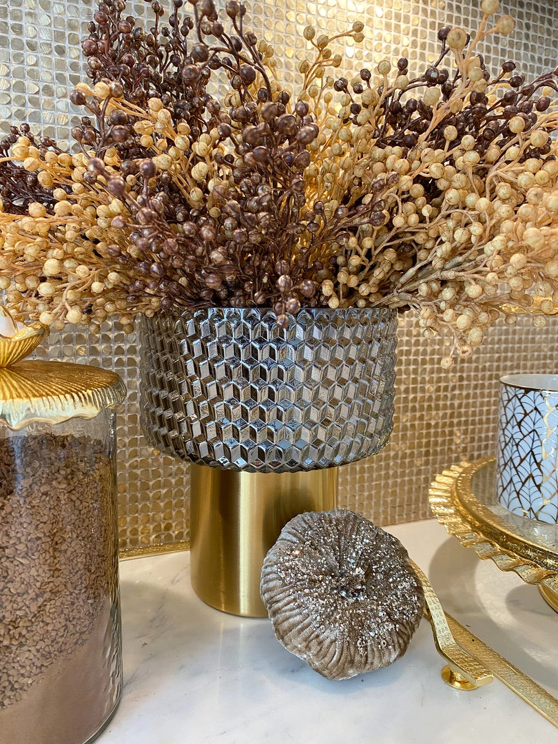 Description: This beautiful vase features a grey studded design seated on a glossy gold base. Perfect for your favorite florals!